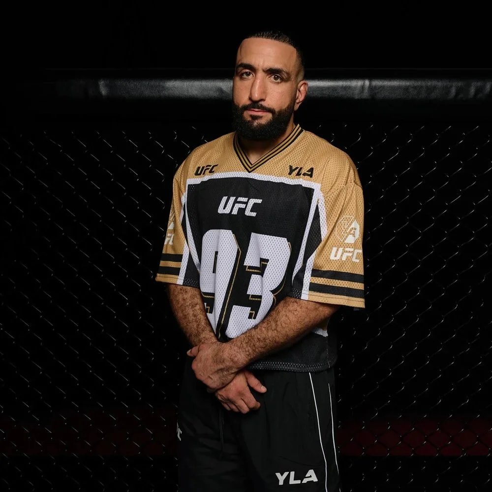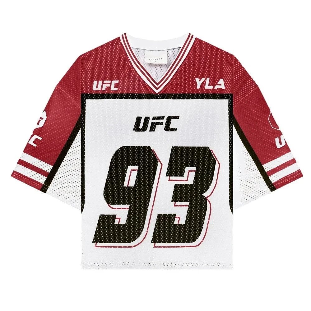 Authentic UFC x YLA collaboration mesh jersey featuring bold #93 graphic, V-neck design, and official branding. Designed for fans and athletes with breathable performance fabric and distinctive streetwear styling.