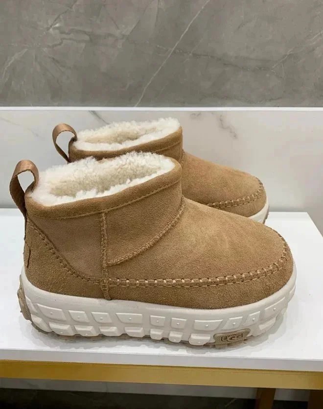 Cozy black UGG mini boots featuring plush faux fur lining and rugged rubber soles for warmth and traction in cold weather.