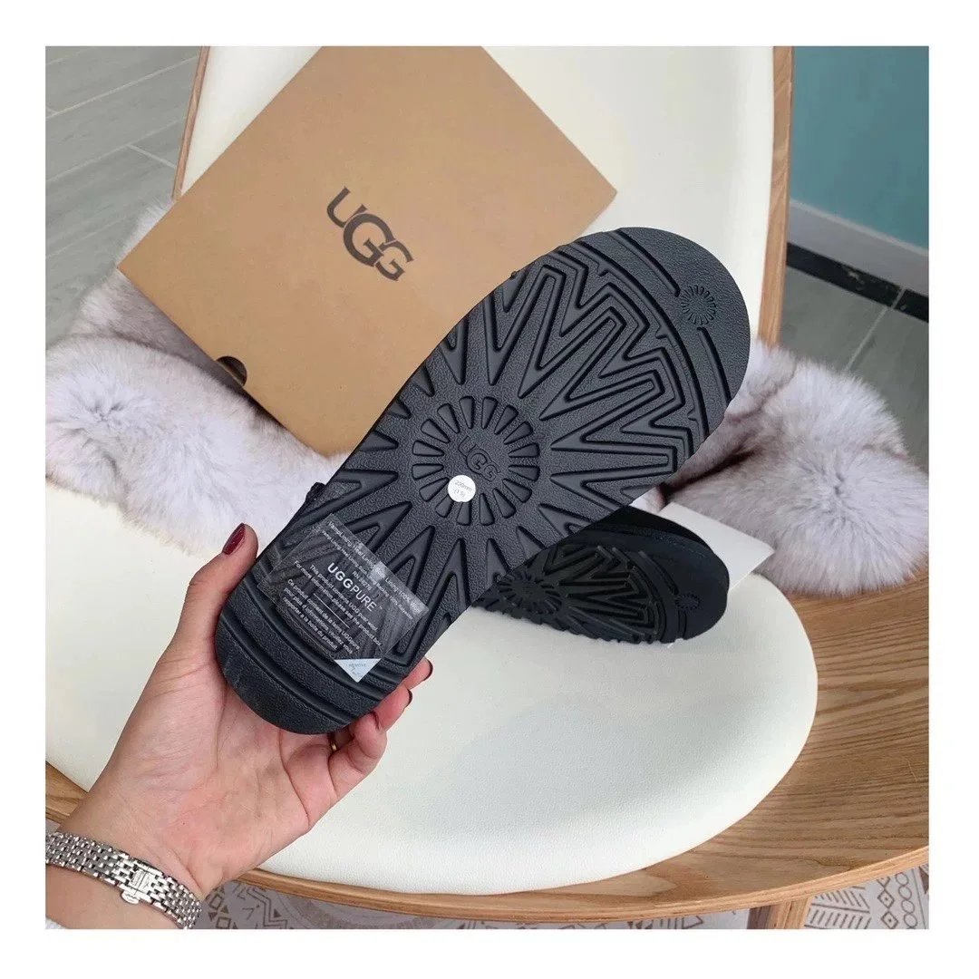 Soft suede Ugg-style ankle boots in grey, black, and beige with plush lining for warmth. Ideal for chilly weather, displayed on pebbles with book and tote bag for lifestyle context.