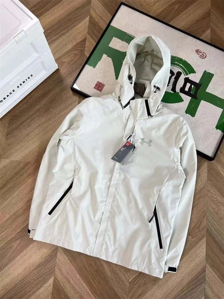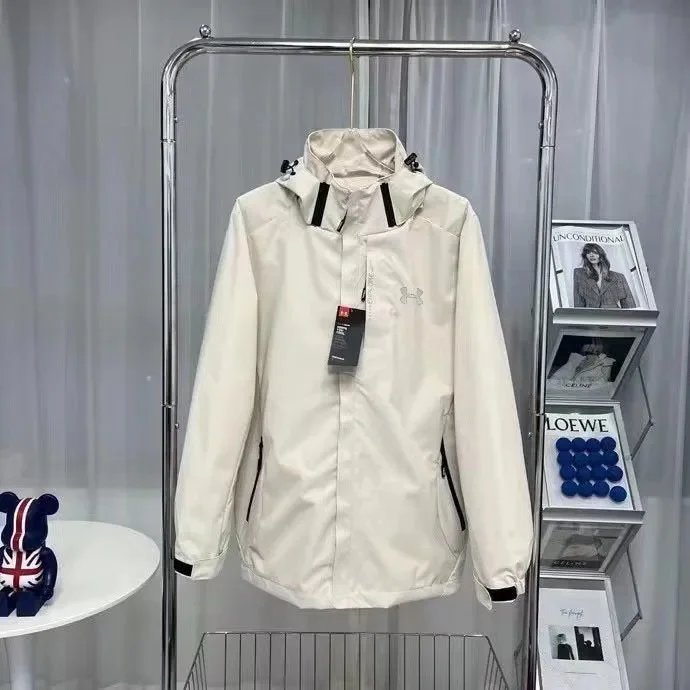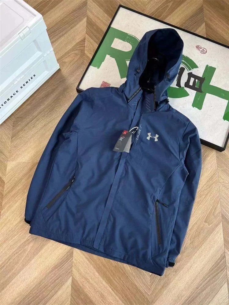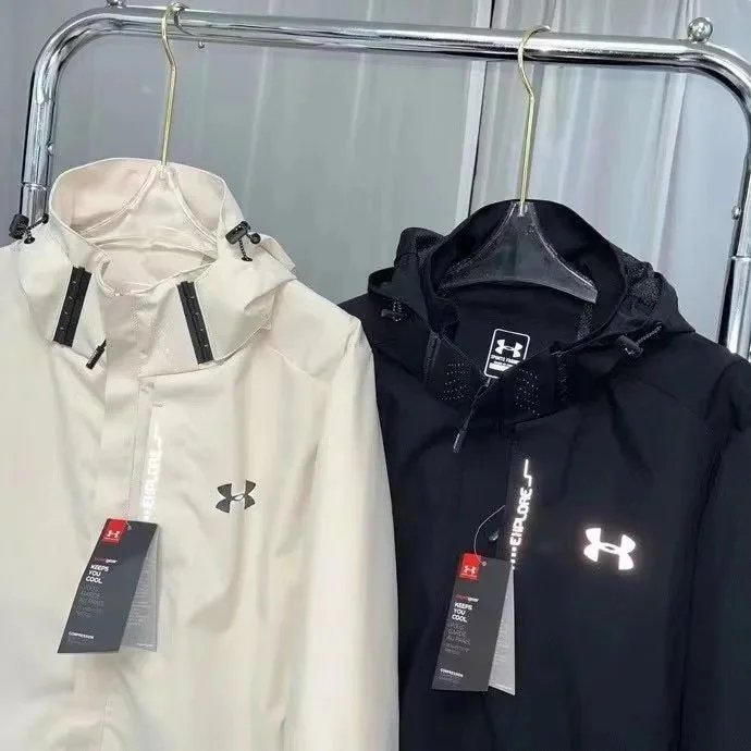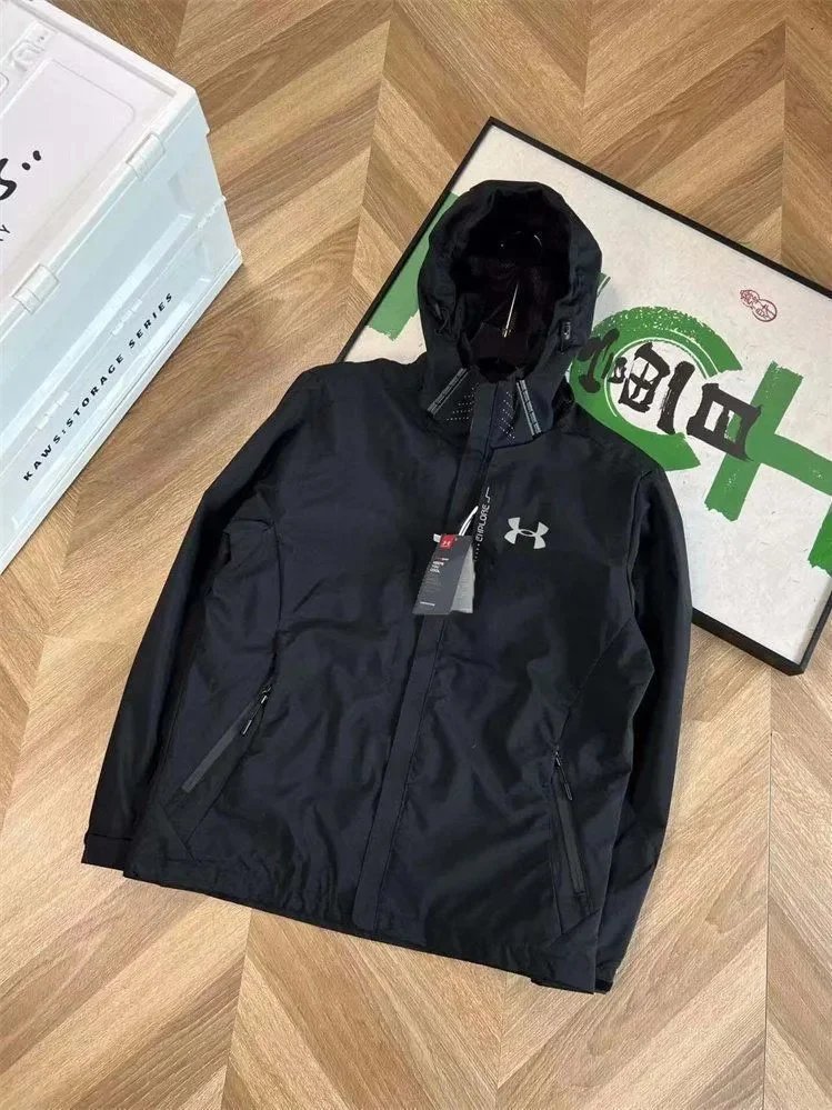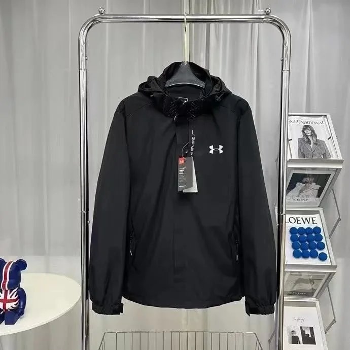 Discover this black Under Armour hooded jacket featuring a prominent logo and functional design for outdoor activities. Built with durable materials for performance and comfort.