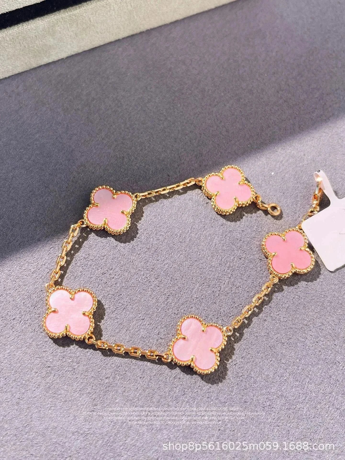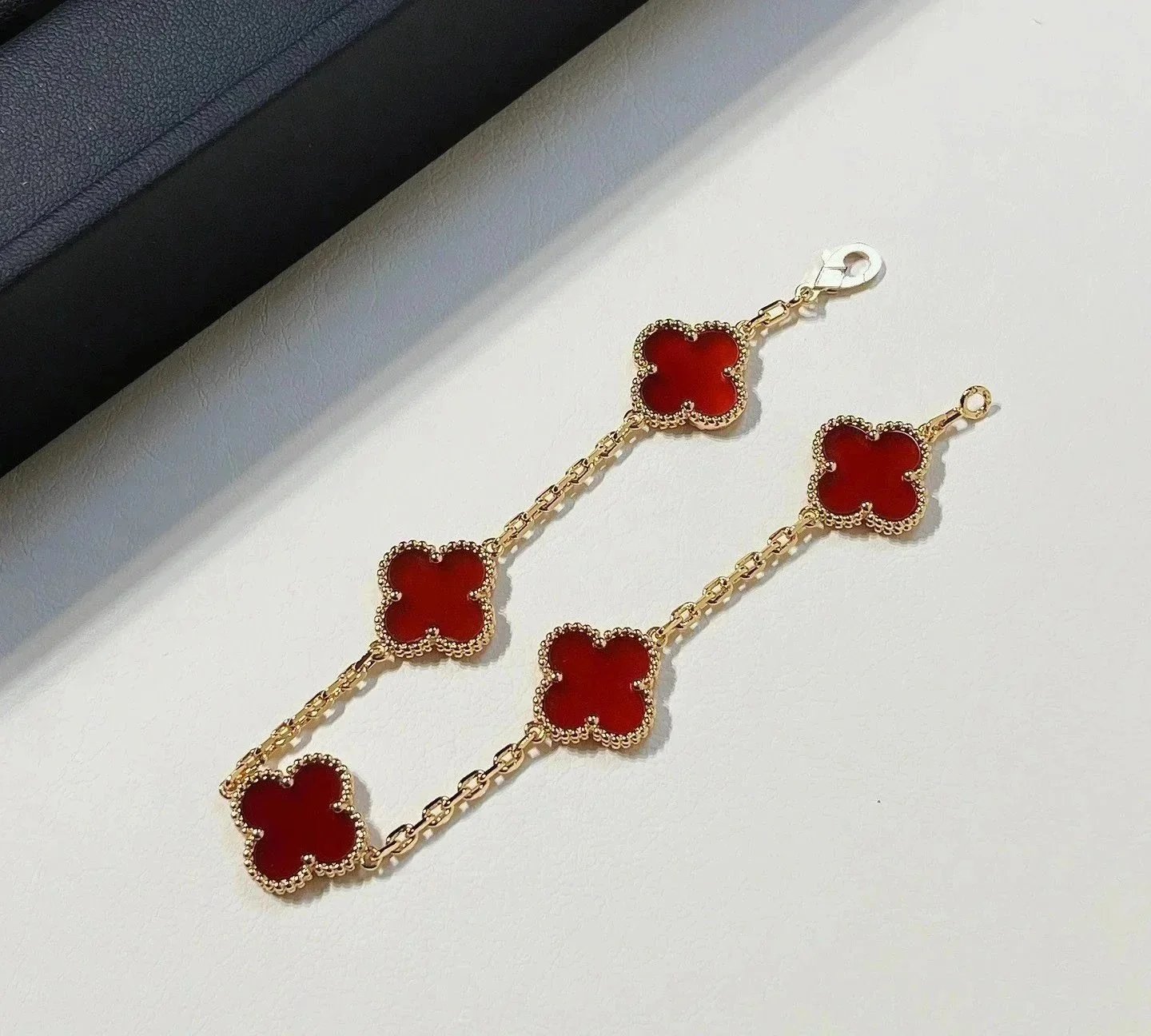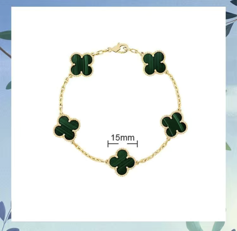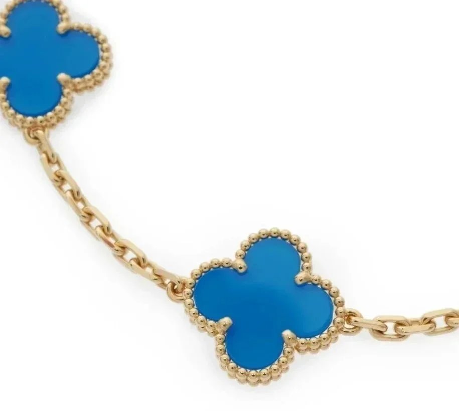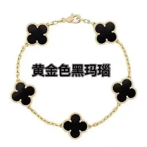 High-end V Gold clover bracelets featuring vibrant gemstone centers in black, white, red, blue, green, and gold tones, set on elegant gold chains for a luxurious look.