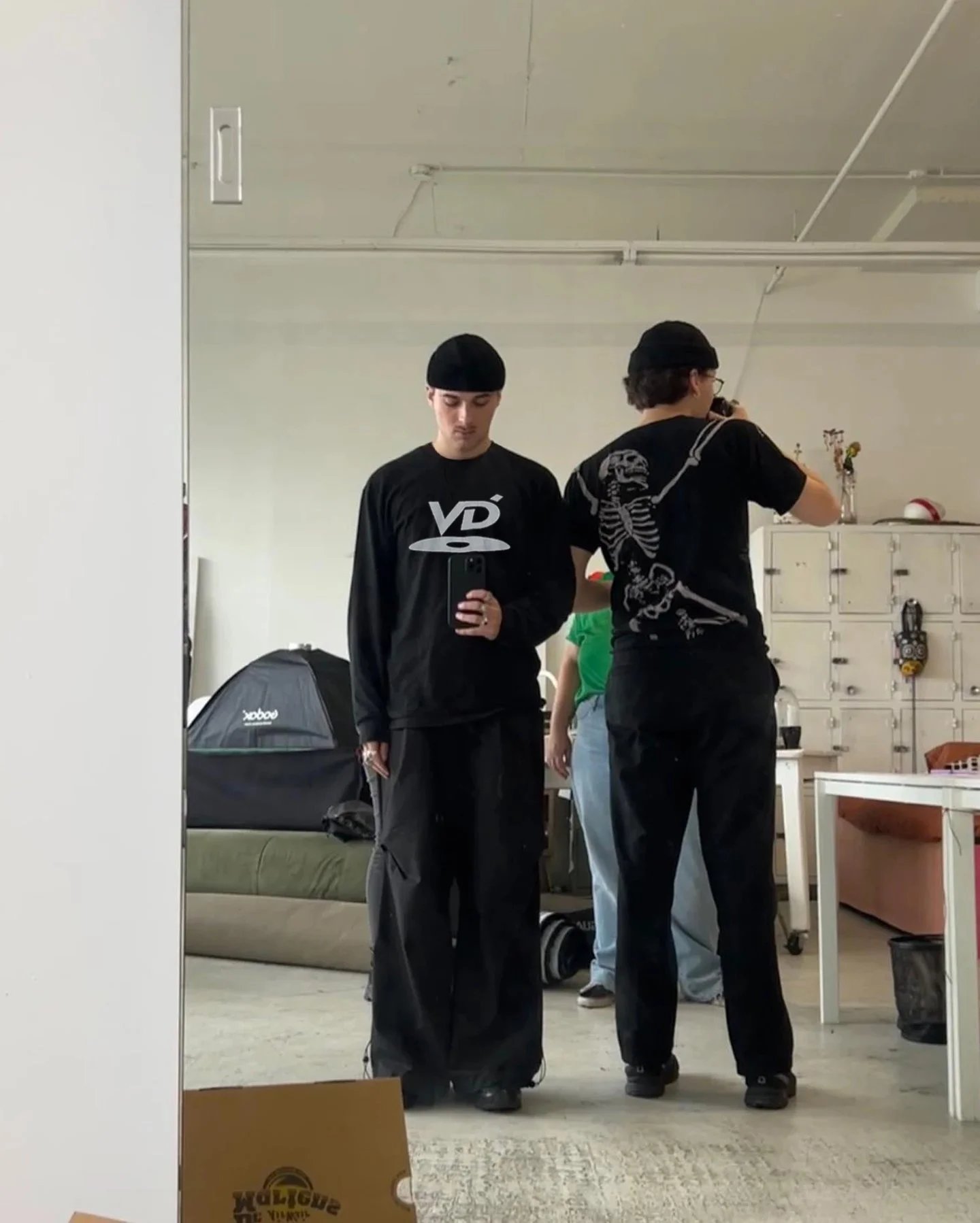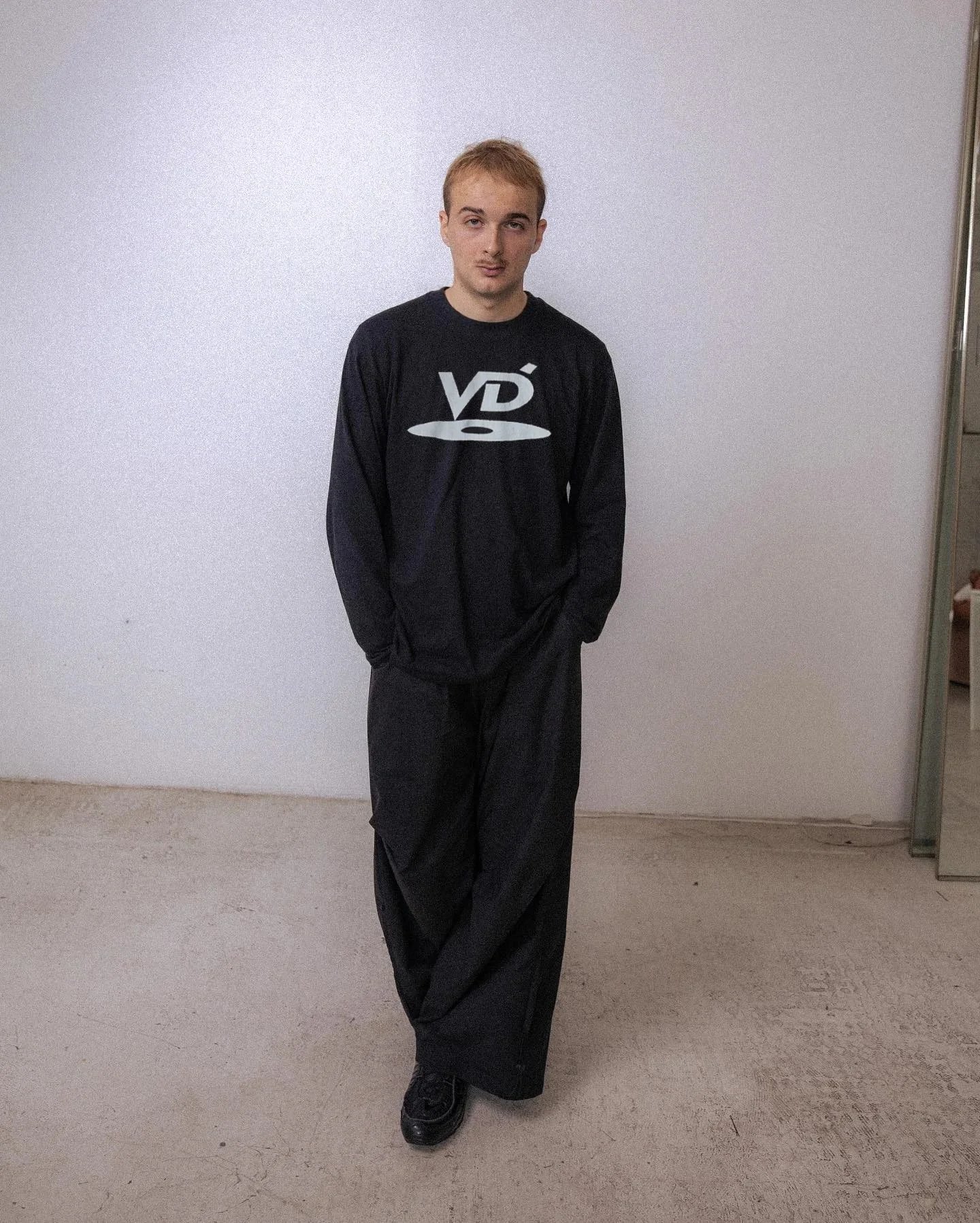 Shop the VD branded long sleeve t-shirt and wide leg pants set — a bold, minimalist streetwear look with signature logo print.