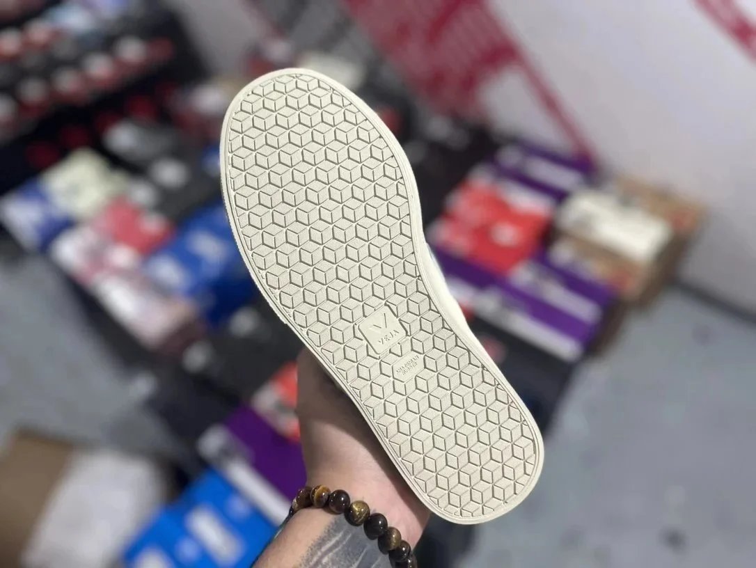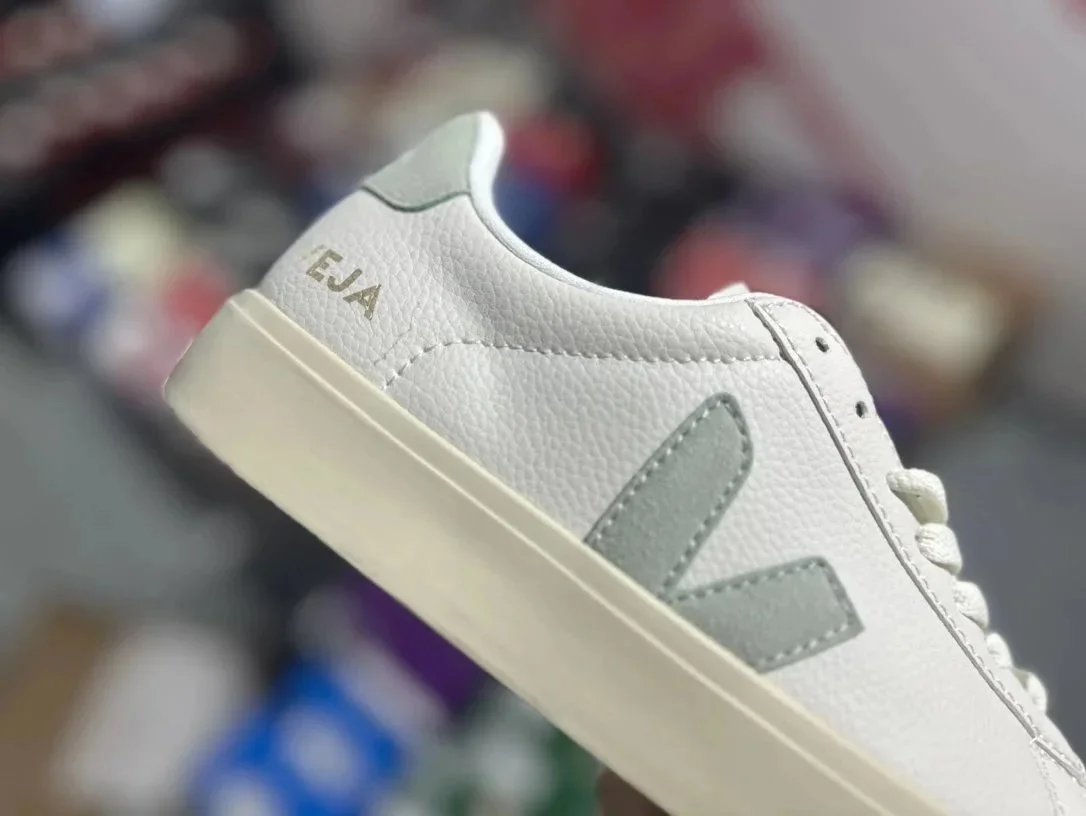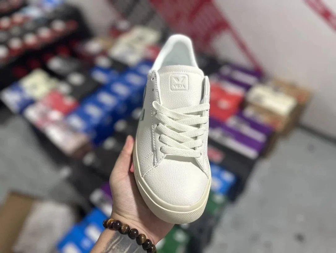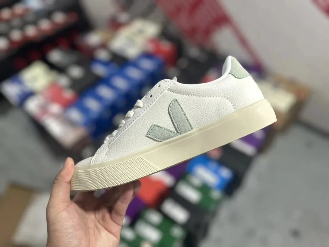 Classic Veja V-10 white leather sneakers featuring a signature green 'V' logo and eco-conscious design, perfect for everyday wear.