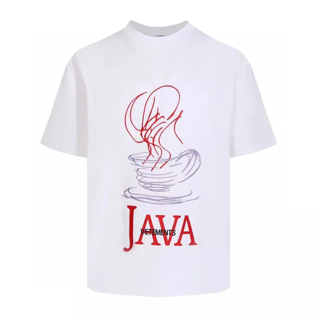 This black VETEMENTS t-shirt features a bold embroidered coffee cup design with 'JAVA' text below. A statement piece for contemporary streetwear enthusiasts.