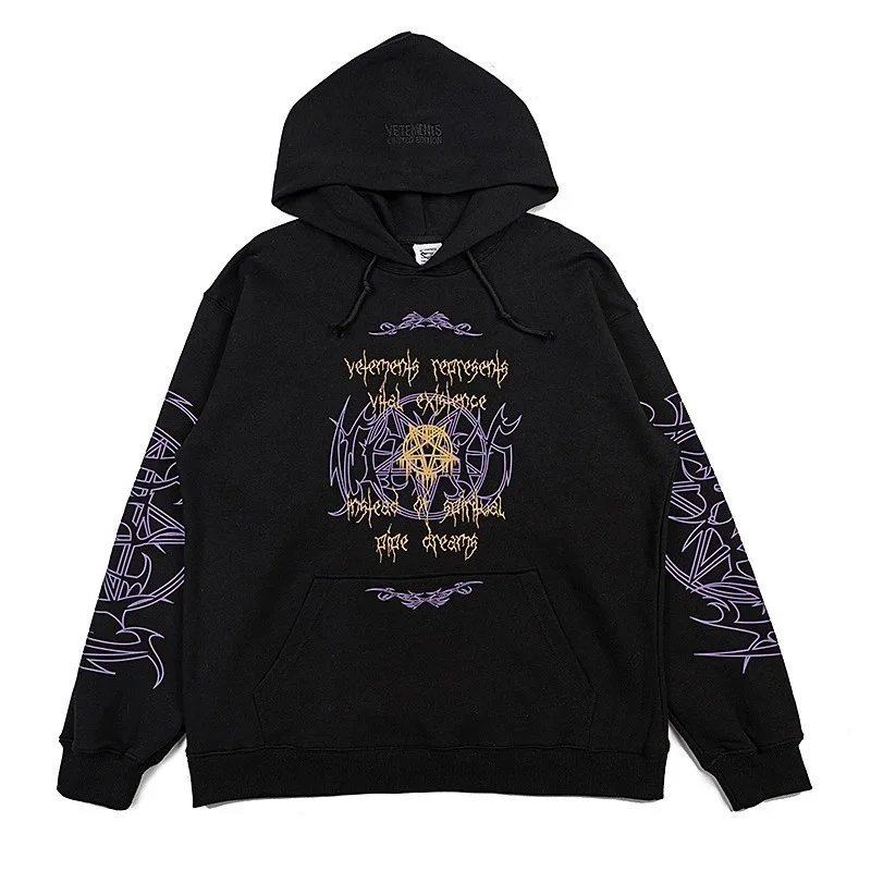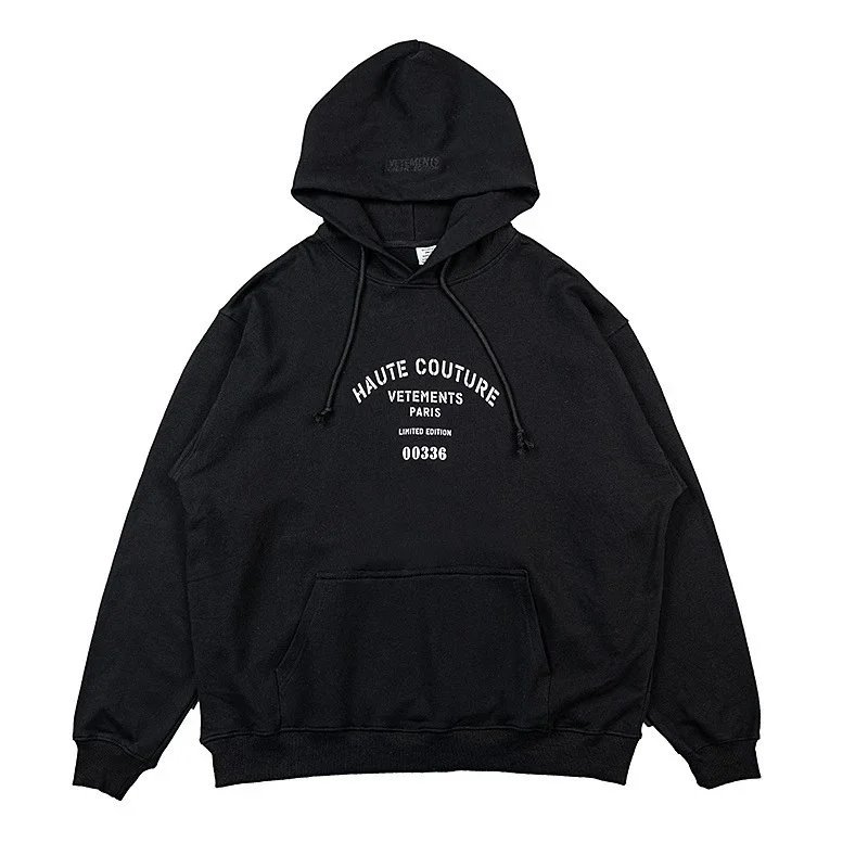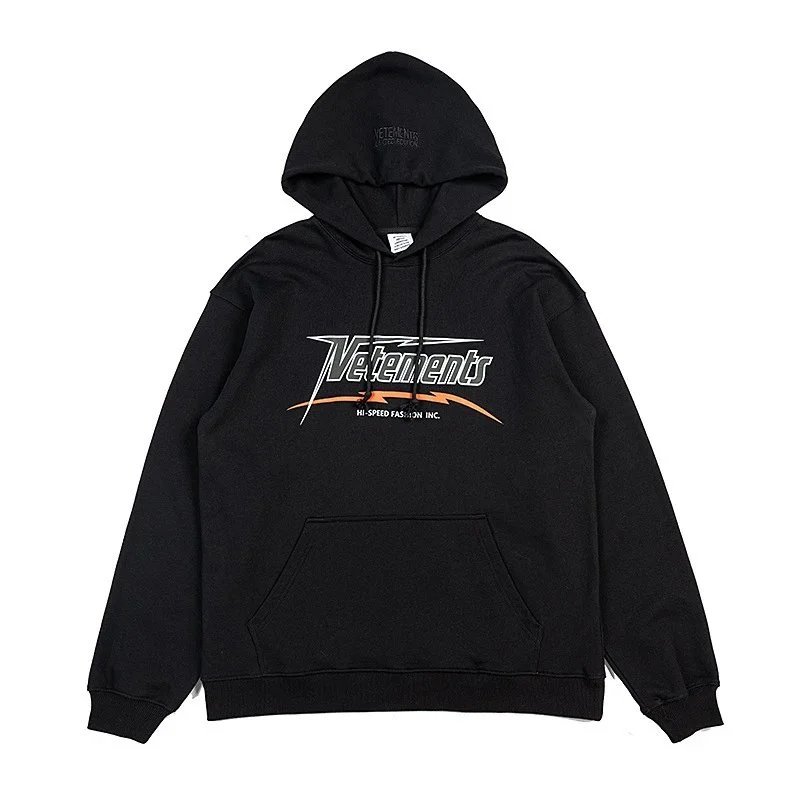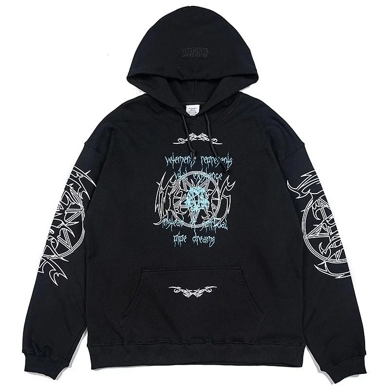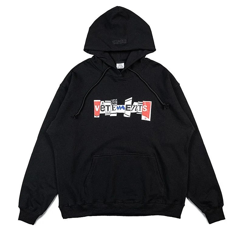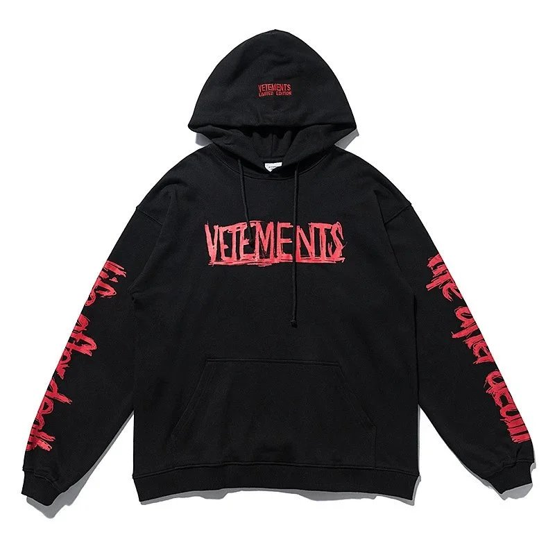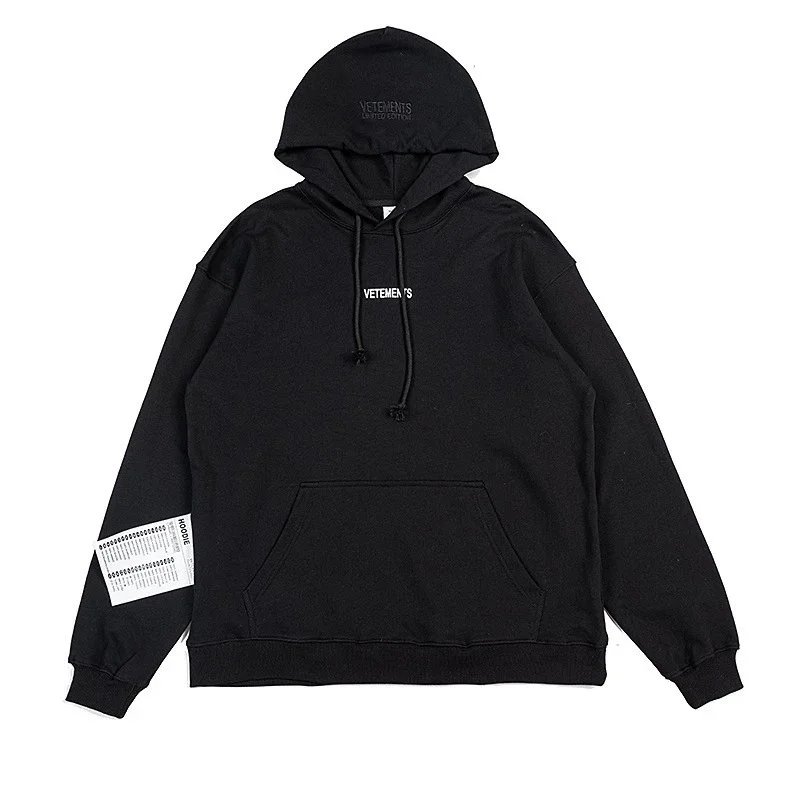 Bold black Vetements hoodie featuring a striking 'Restricted' R-rating graphic inspired by adult entertainment ratings. A statement piece for edgy streetwear.