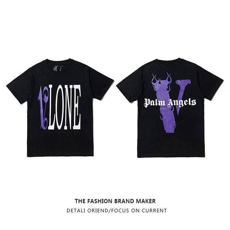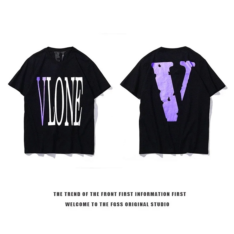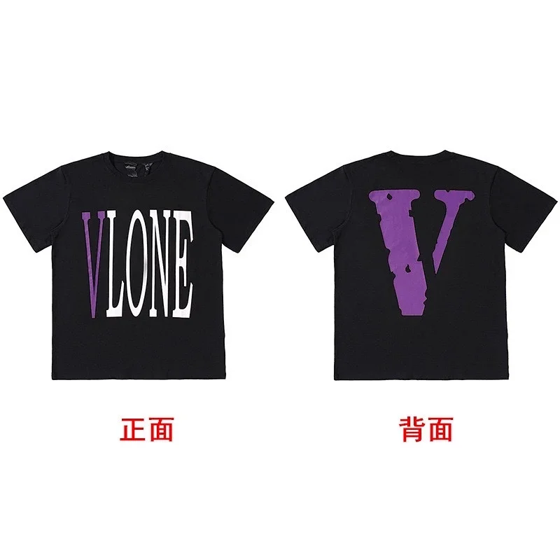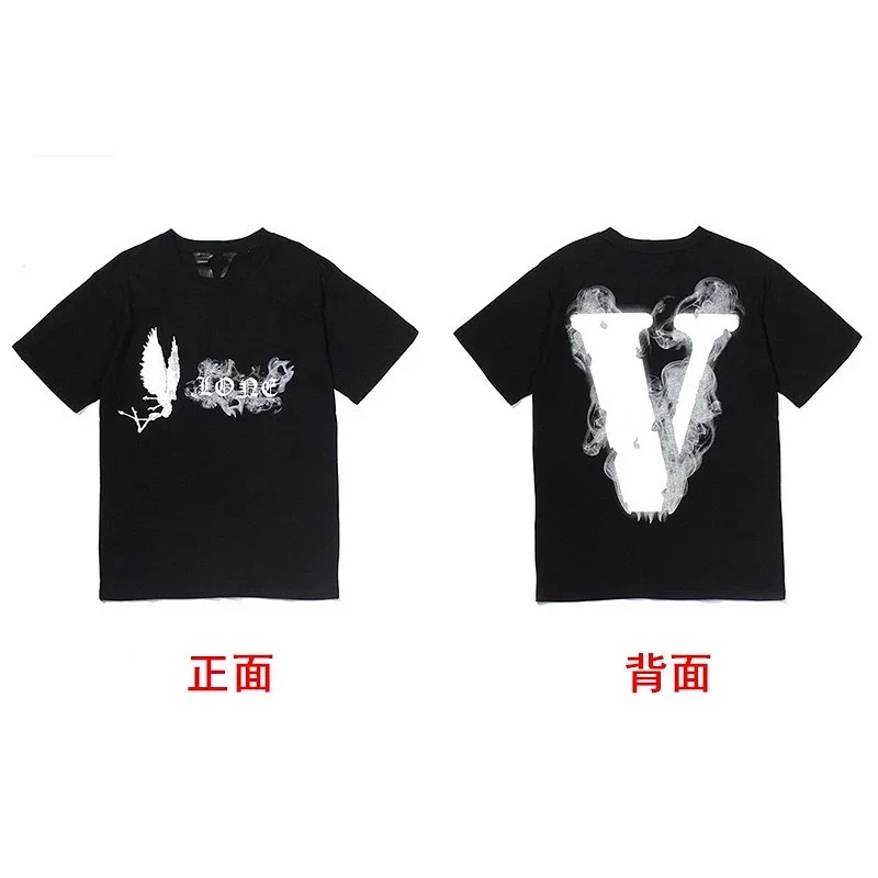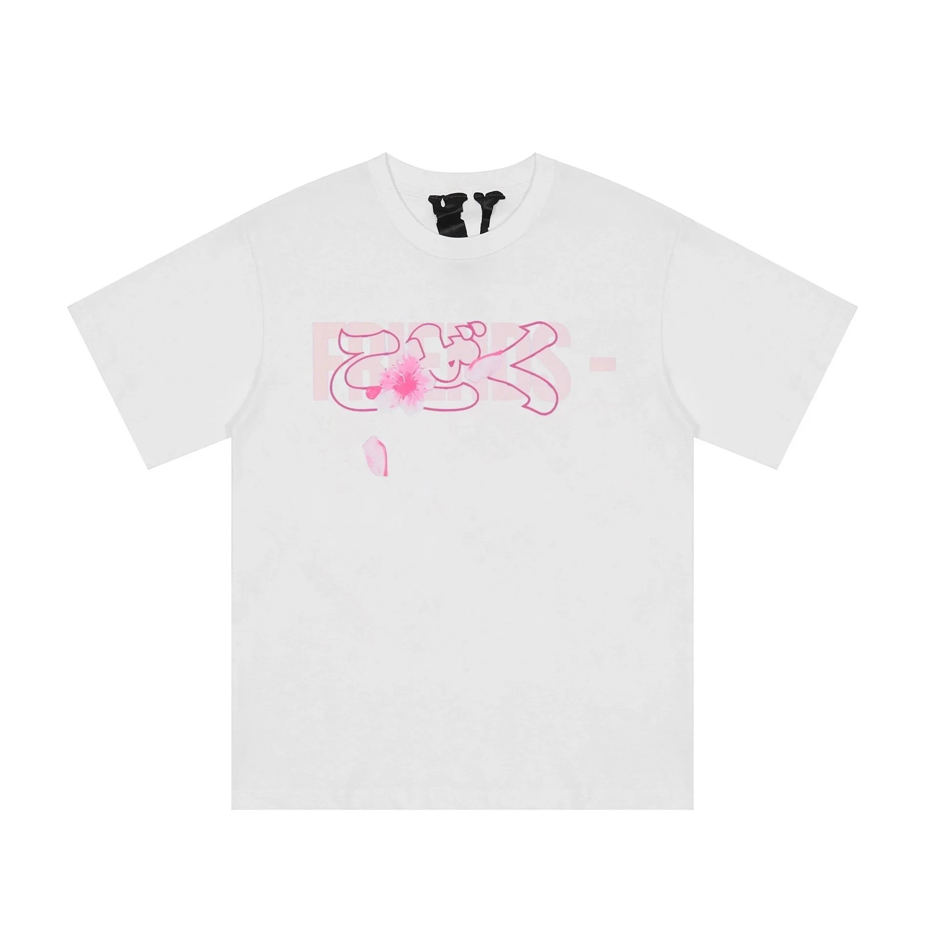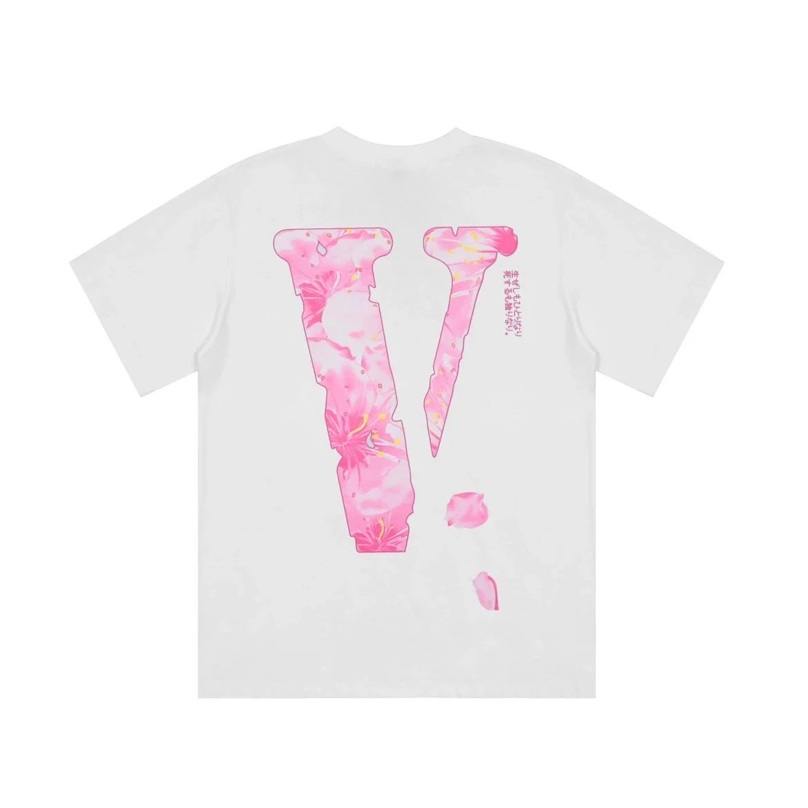 Black VLONE t-shirt featuring a vibrant pink cherry blossom patterned 'V' logo with falling petals and vertical Japanese text. Bold streetwear design for fashion-forward individuals.