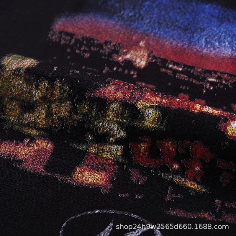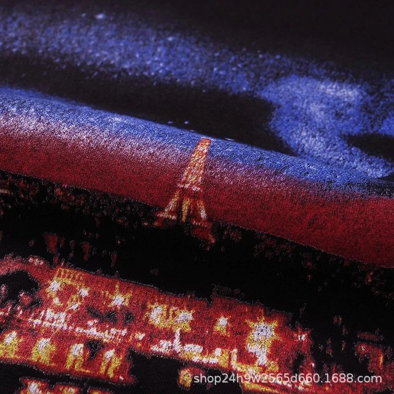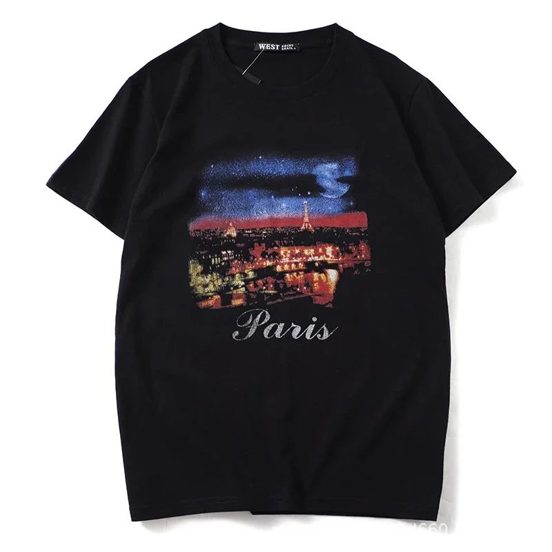 Black t-shirt featuring a vibrant Paris night skyline with the Eiffel Tower and glowing city lights, paired with 'Paris' text. Ideal for travel enthusiasts and urban style lovers.