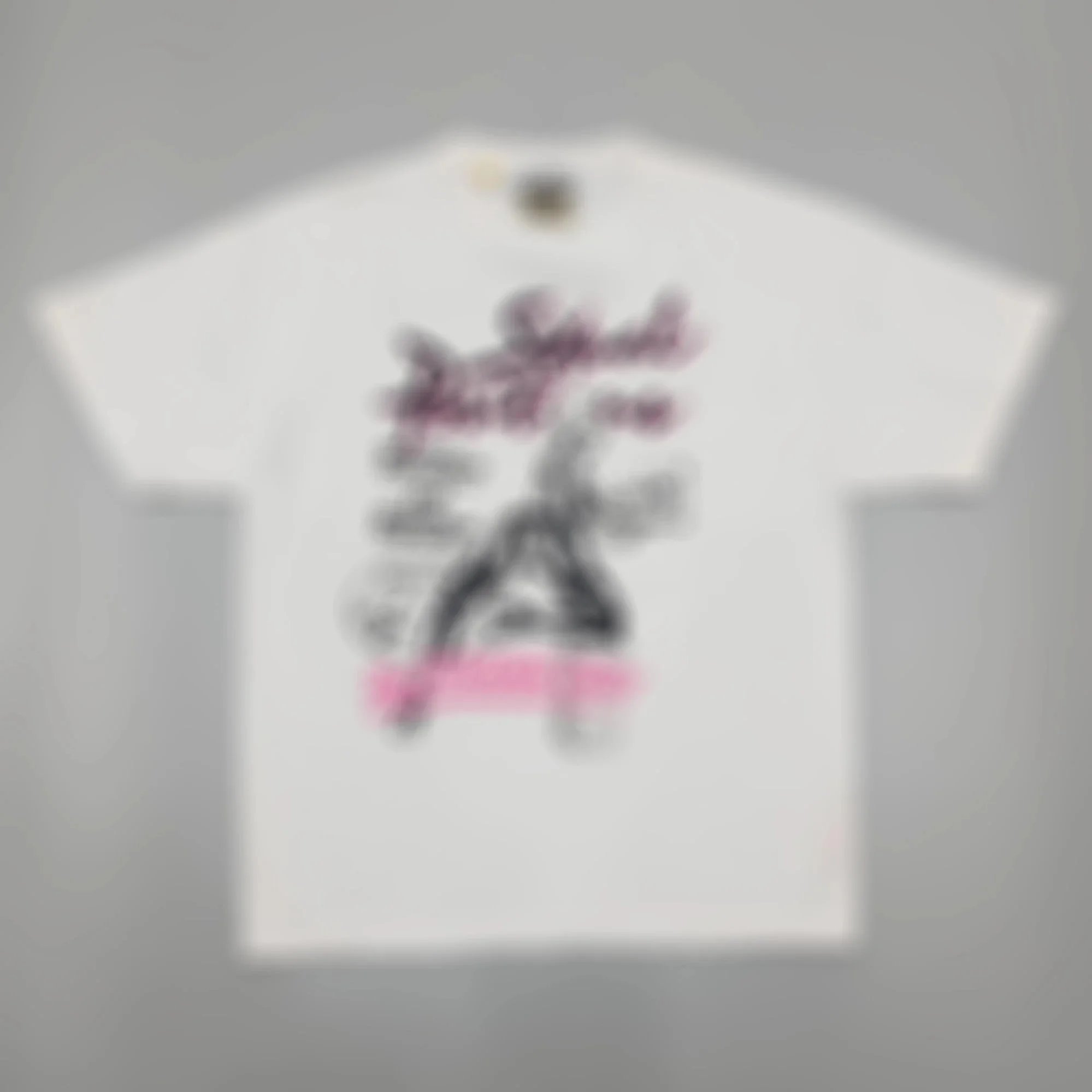 A white t-shirt featuring an abstract graphic design in black, pink, and purple hues. Ideal for casual daily wear or as a statement piece in streetwear collections.