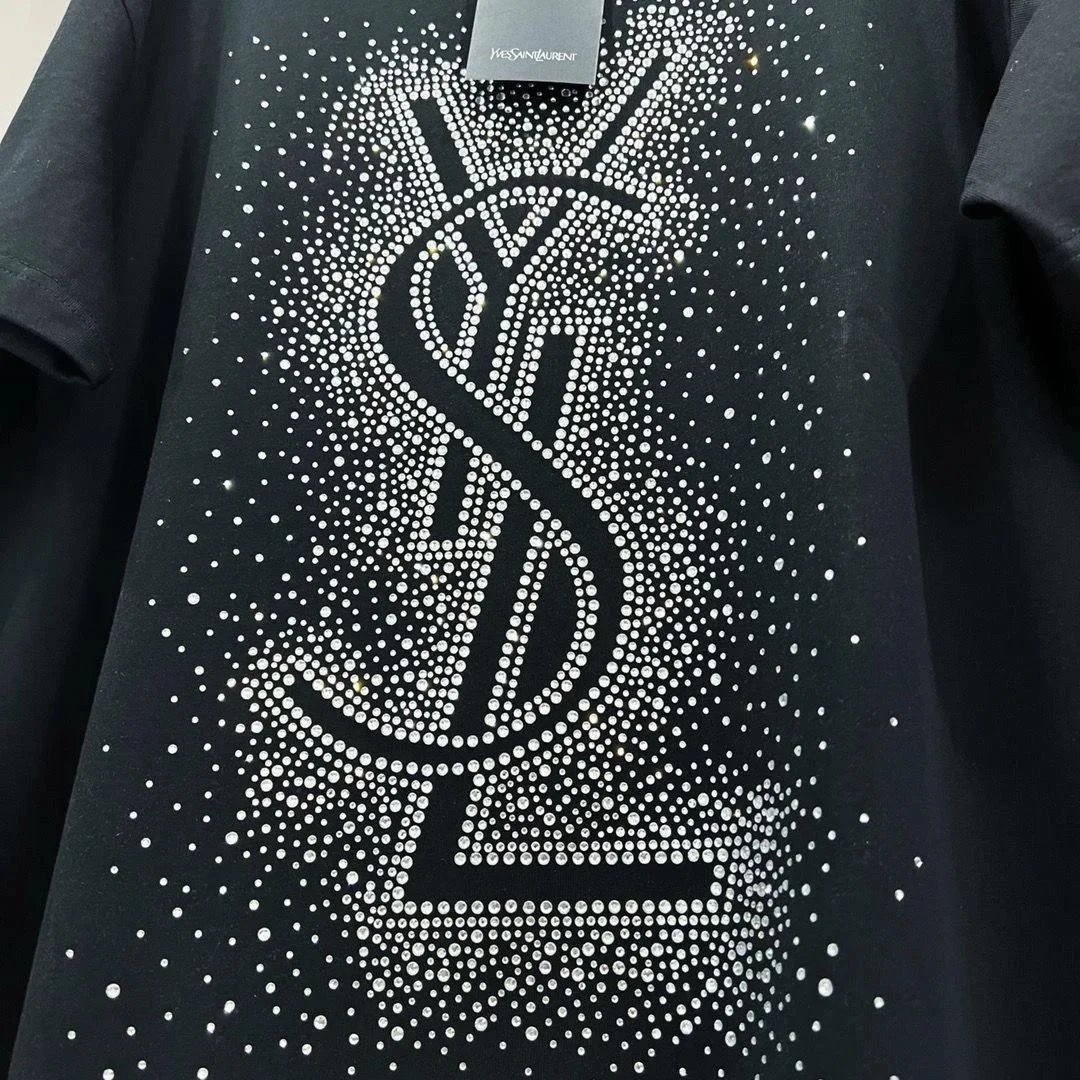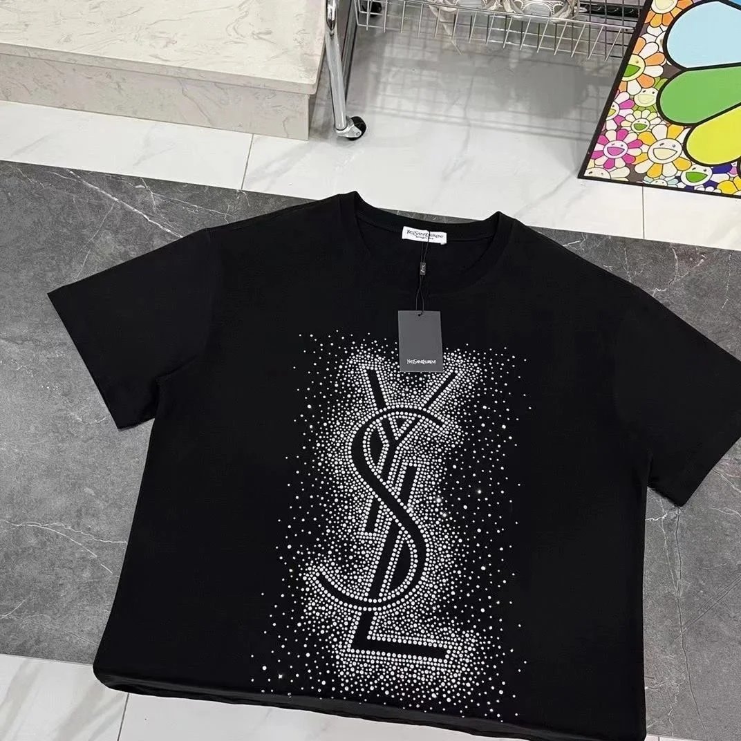 Stylish black YSL t-shirt featuring a dazzling rhinestone-embellished logo. Perfect for making a bold fashion statement with premium design and craftsmanship.