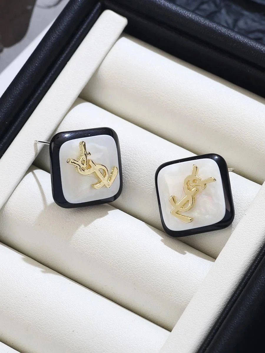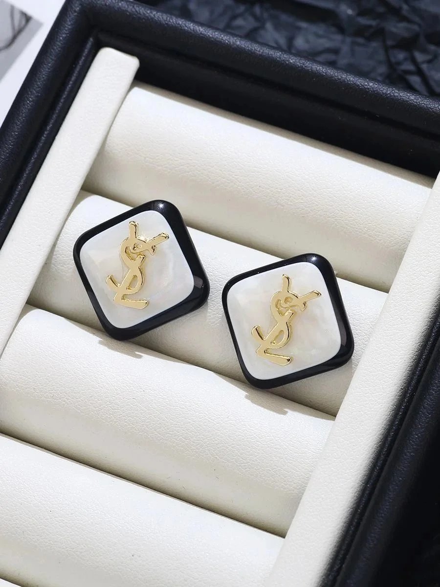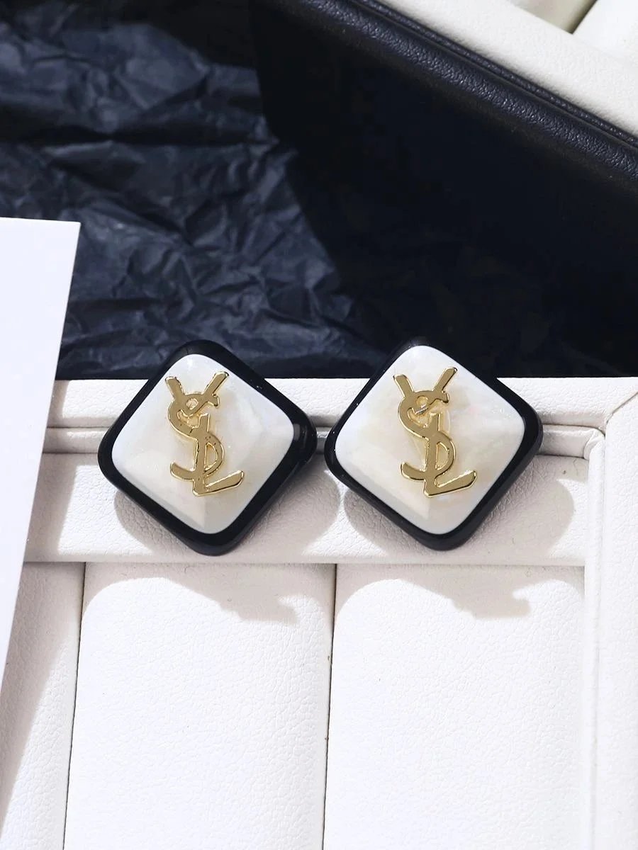 Elegant YSL square stud earrings featuring a black border, white mother-of-pearl center, and iconic gold-tone logo. Perfect for adding luxury sophistication to any ensemble.
