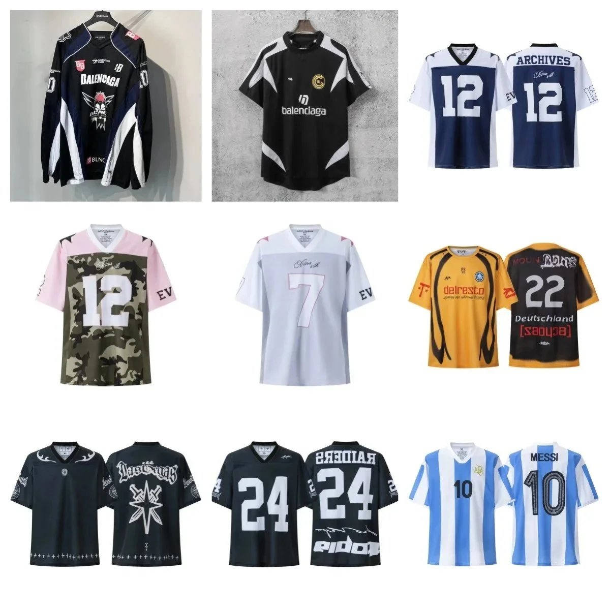 High-end designer football jerseys featuring collaborations with Balenciaga, Trapstar, Archives, and more. Includes iconic player numbers like Messi's 10 and Germany's 22 on uniquely styled kits.
