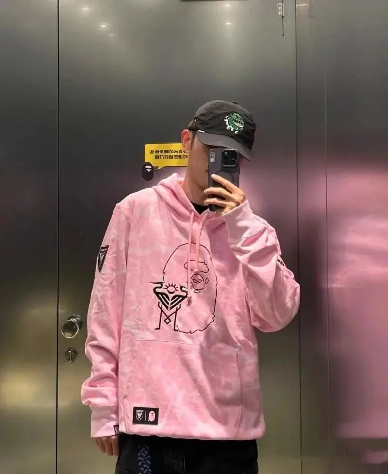 BAPE Miami collaboration apparel featuring hoodies and shorts in black, pink, and gray camouflage patterns with iconic BAPE 93 logo and Miami branding. Designed for streetwear enthusiasts.