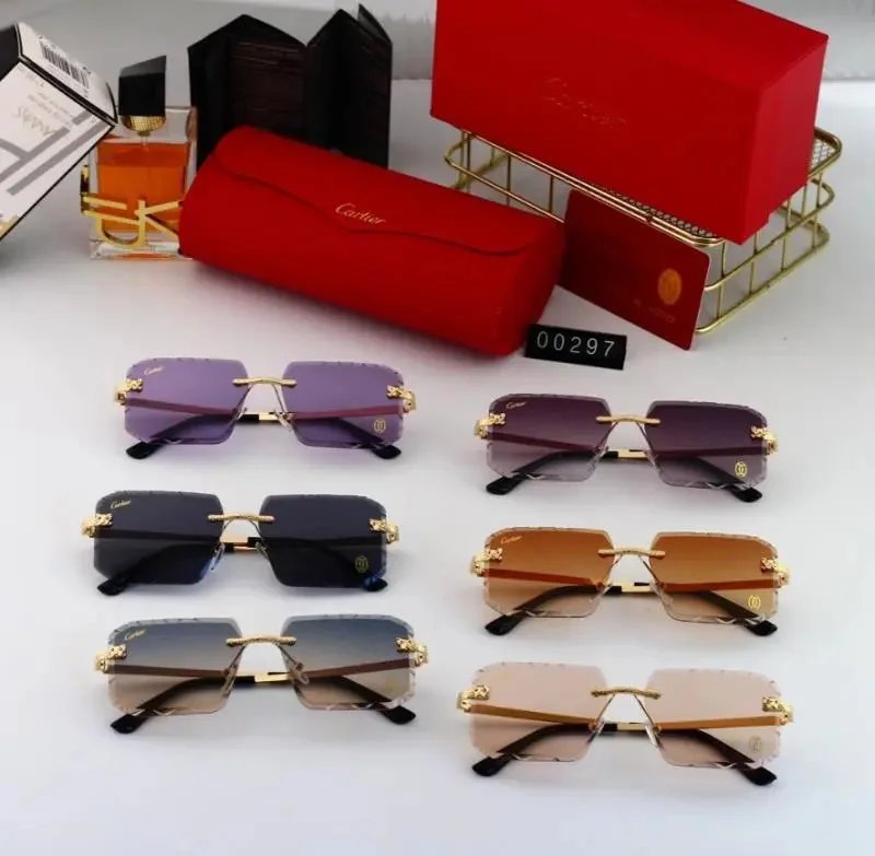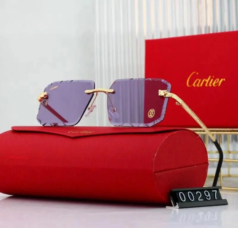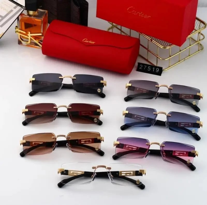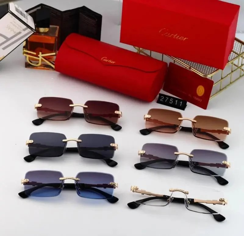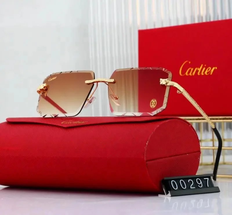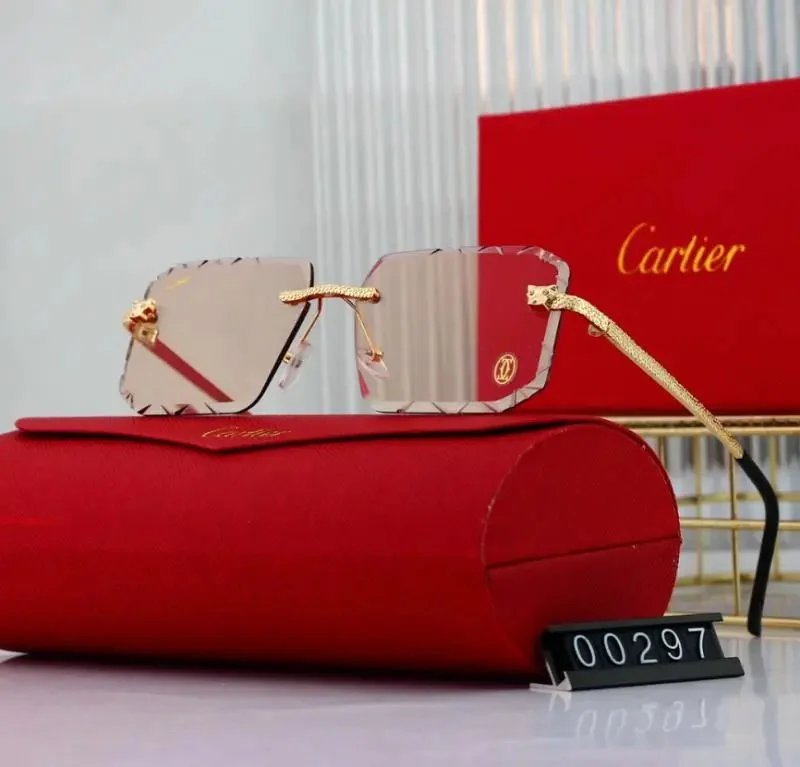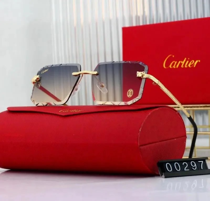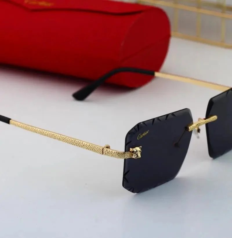 Elevate your look with Cartier’s iconic rectangular rimless sunglasses, featuring gradient lenses and signature gold detailing for timeless elegance.