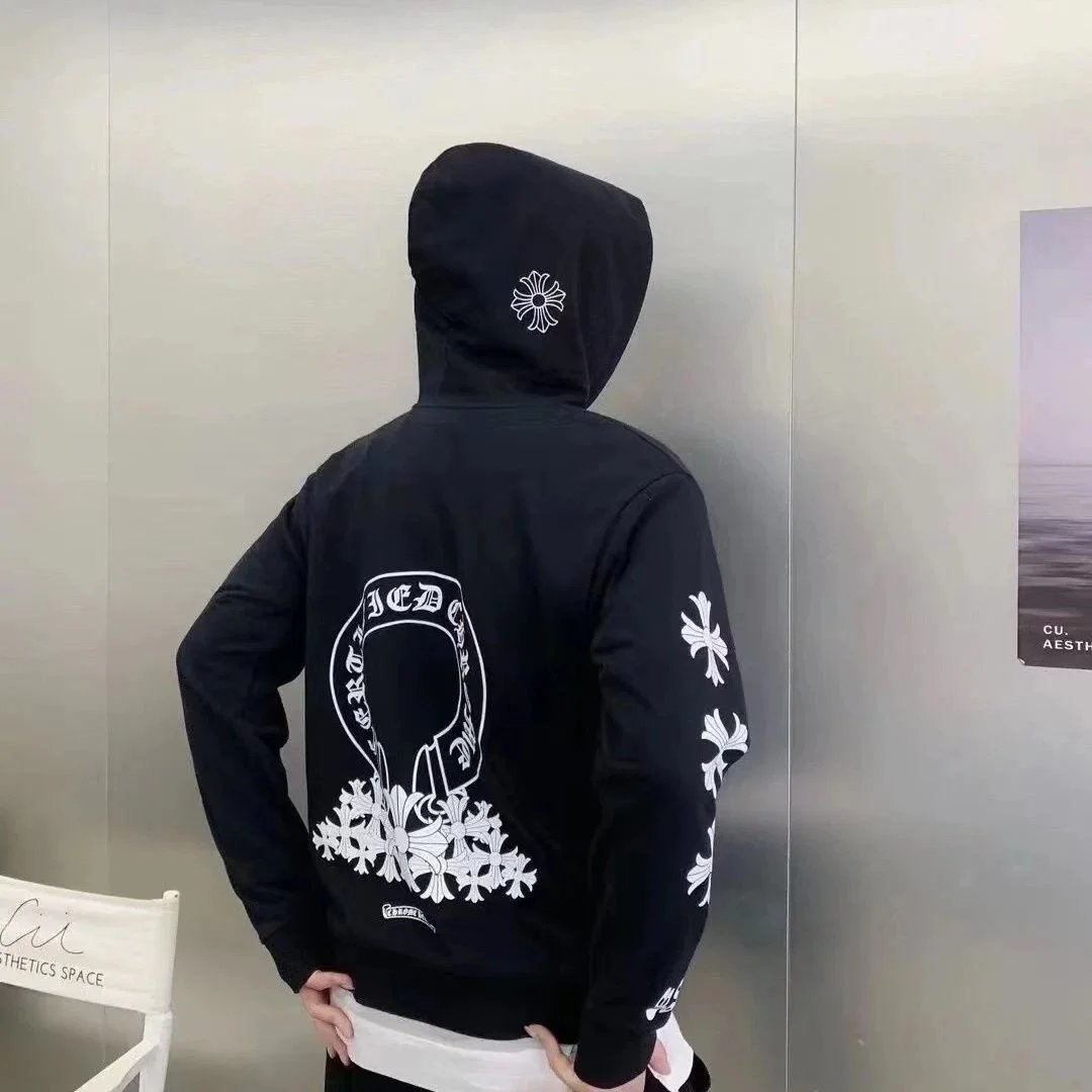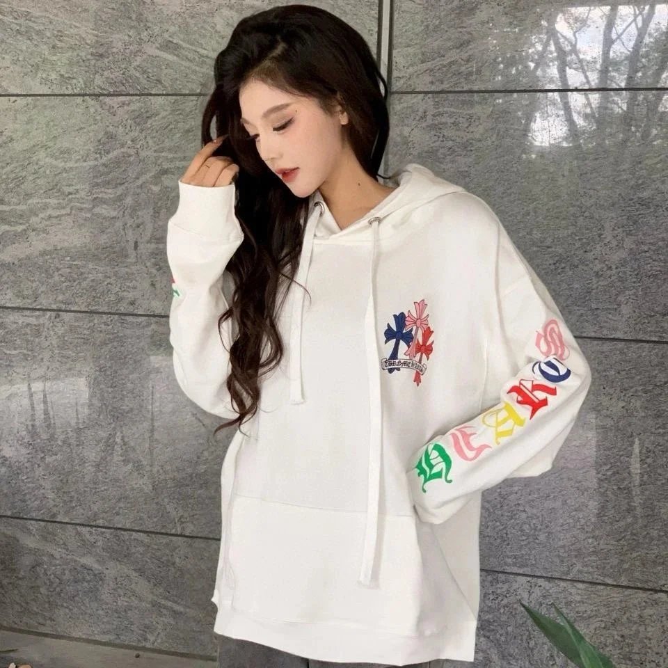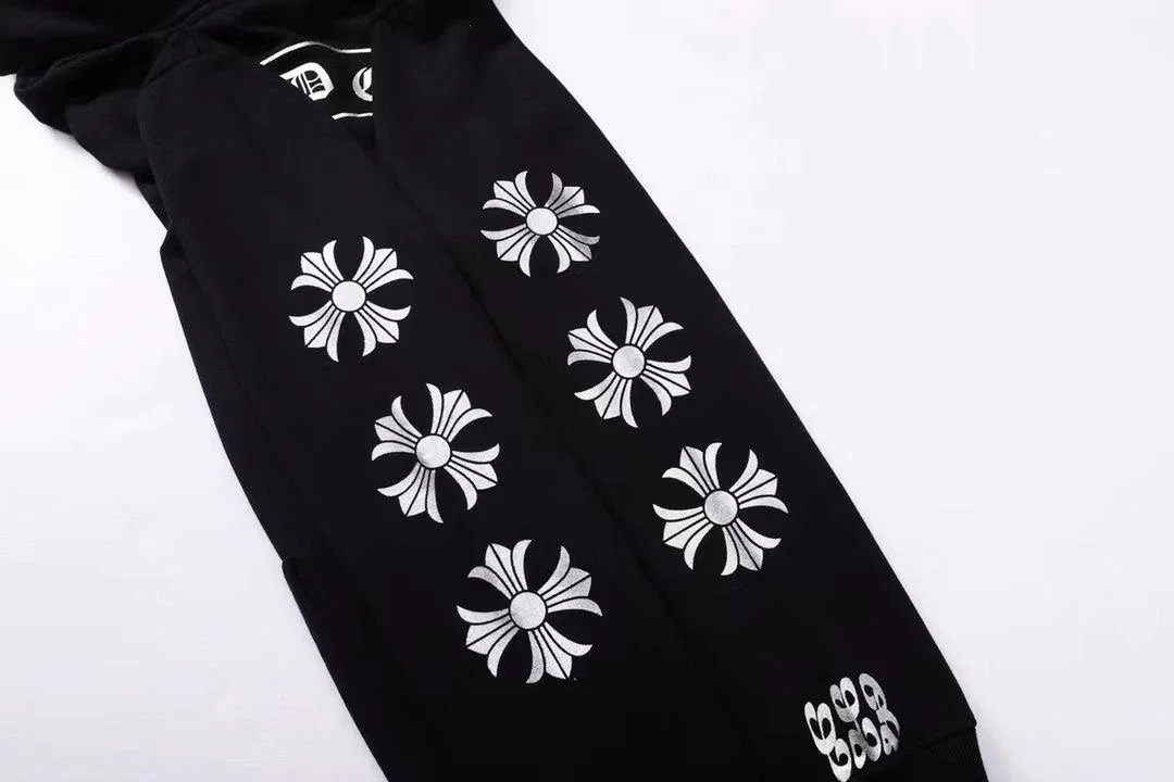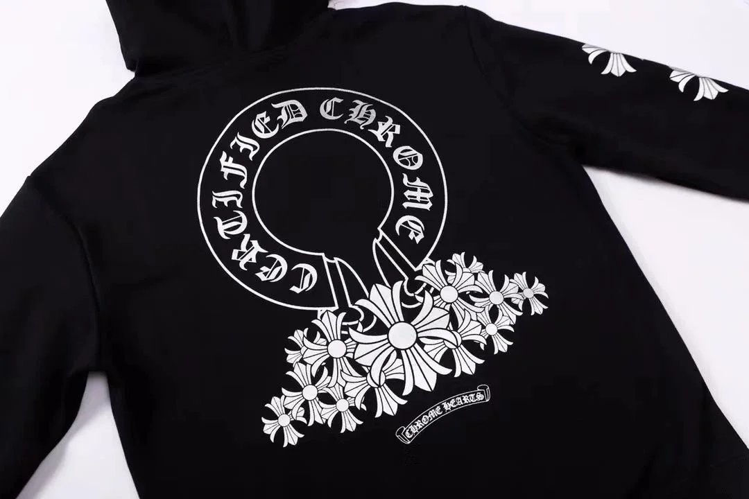 Premium Chrome Hearts hoodies and sweatshirts featuring iconic cross motifs in monochrome and vibrant multicolor prints, with detailed embroidery and signature sleeve graphics.