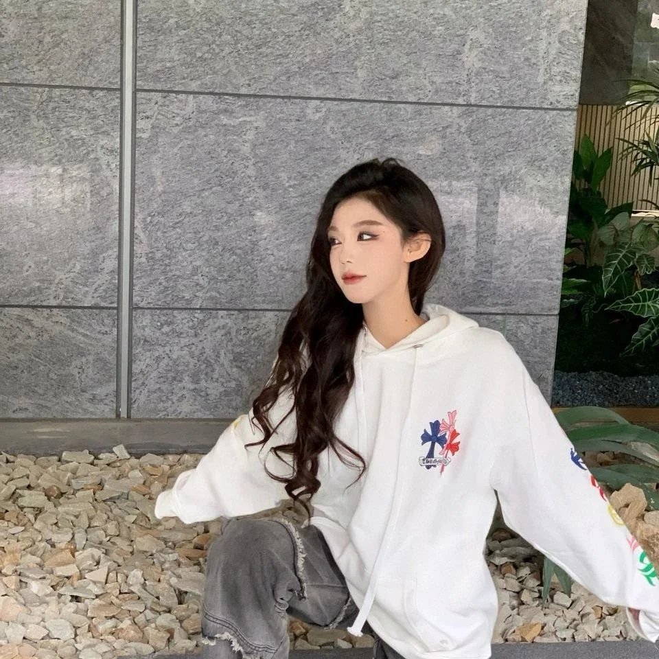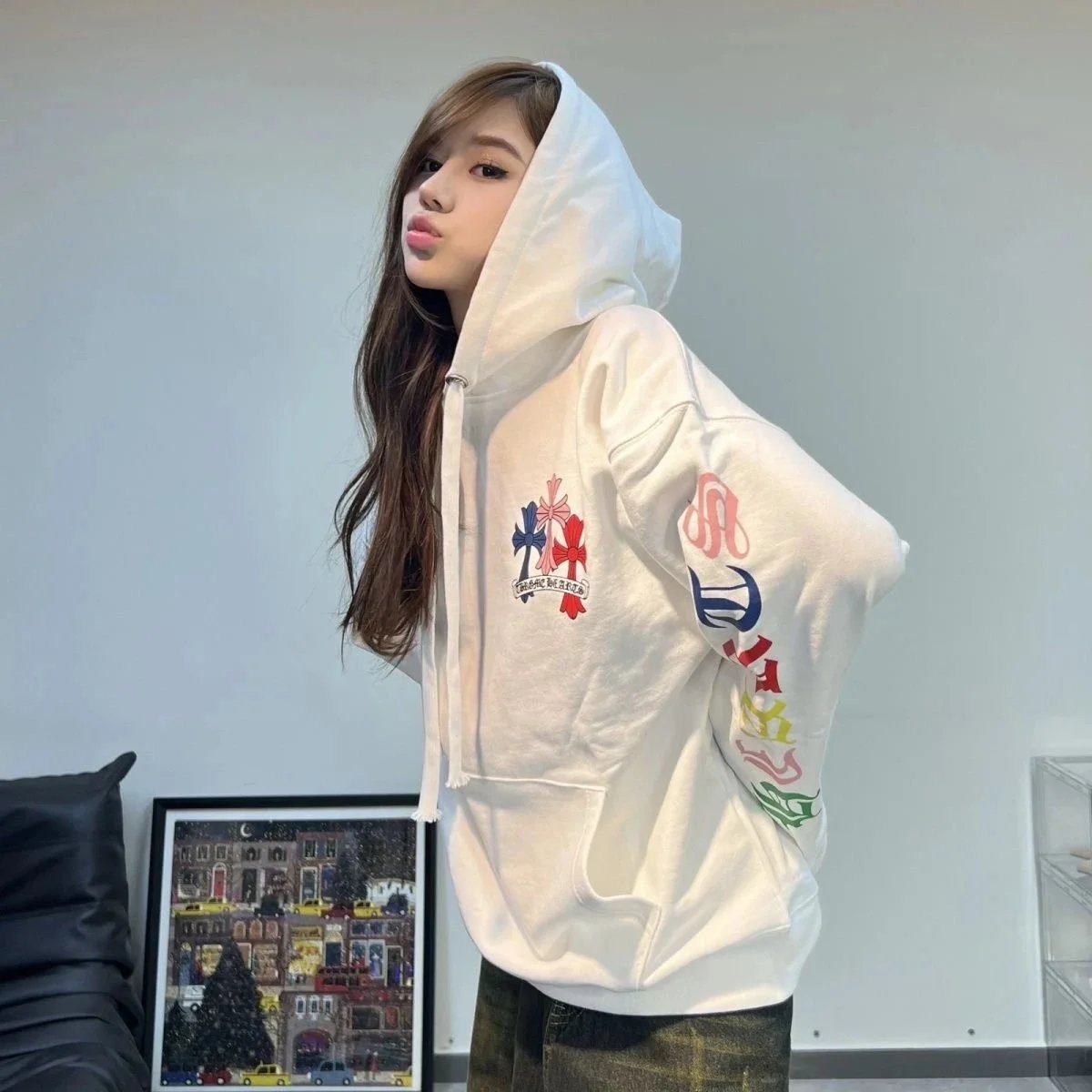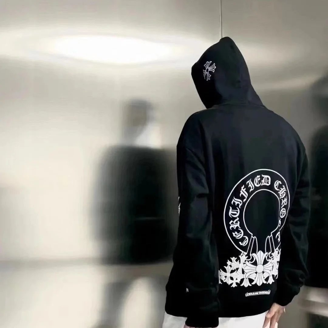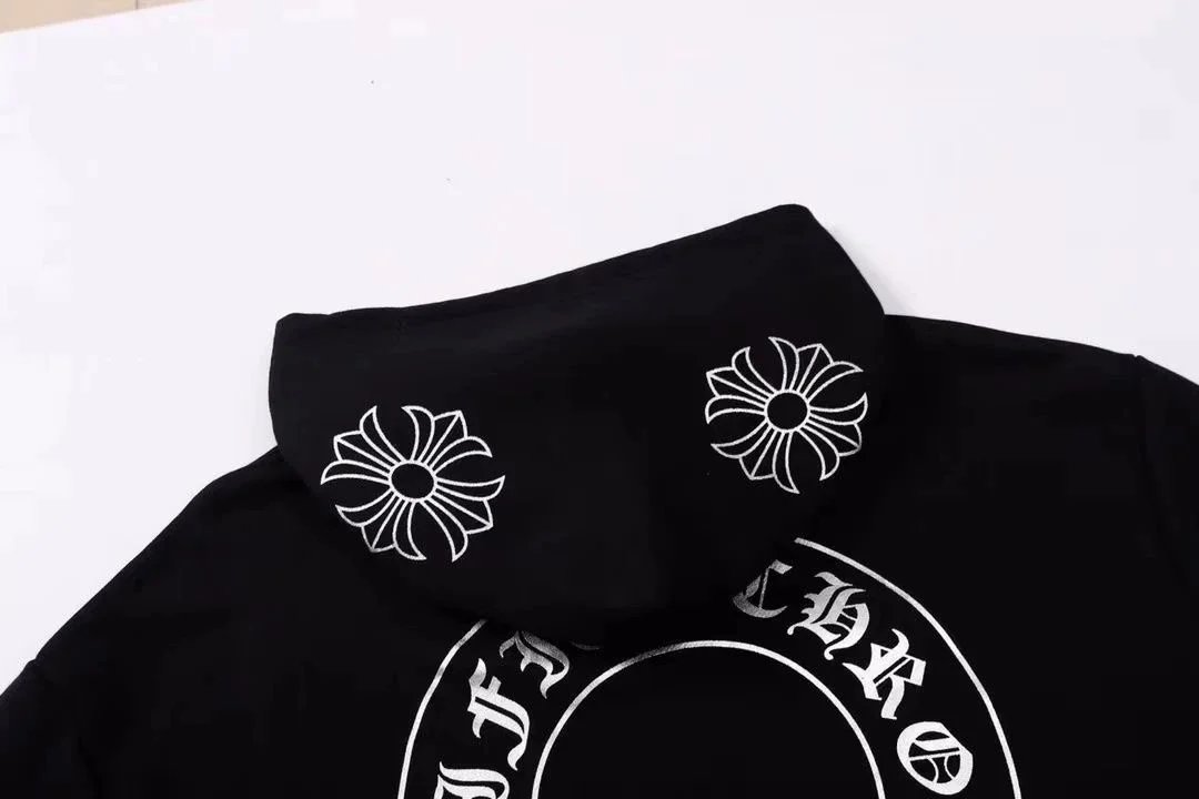Premium Chrome Hearts hoodies and sweatshirts featuring iconic cross motifs in monochrome and vibrant multicolor prints, with detailed embroidery and signature sleeve graphics.