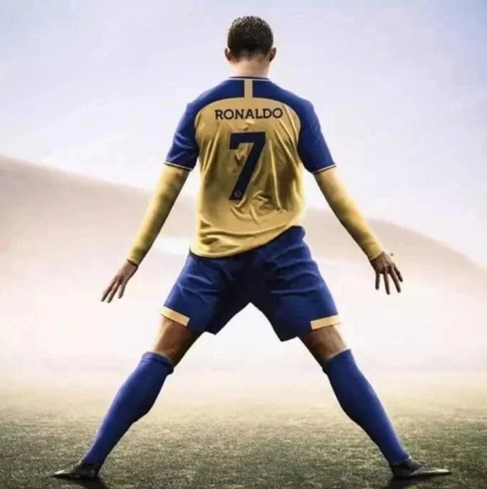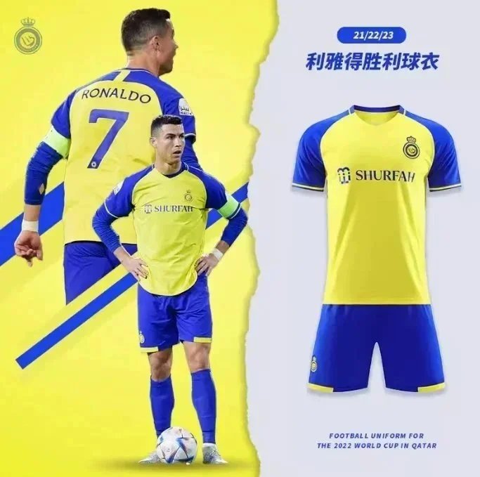 Official yellow home jersey worn by Cristiano Ronaldo for Al Nassr in the 2022-23 season, featuring KAFD branding and designed for the 2023 Qatar World Cup. Includes matching shorts and socks.
