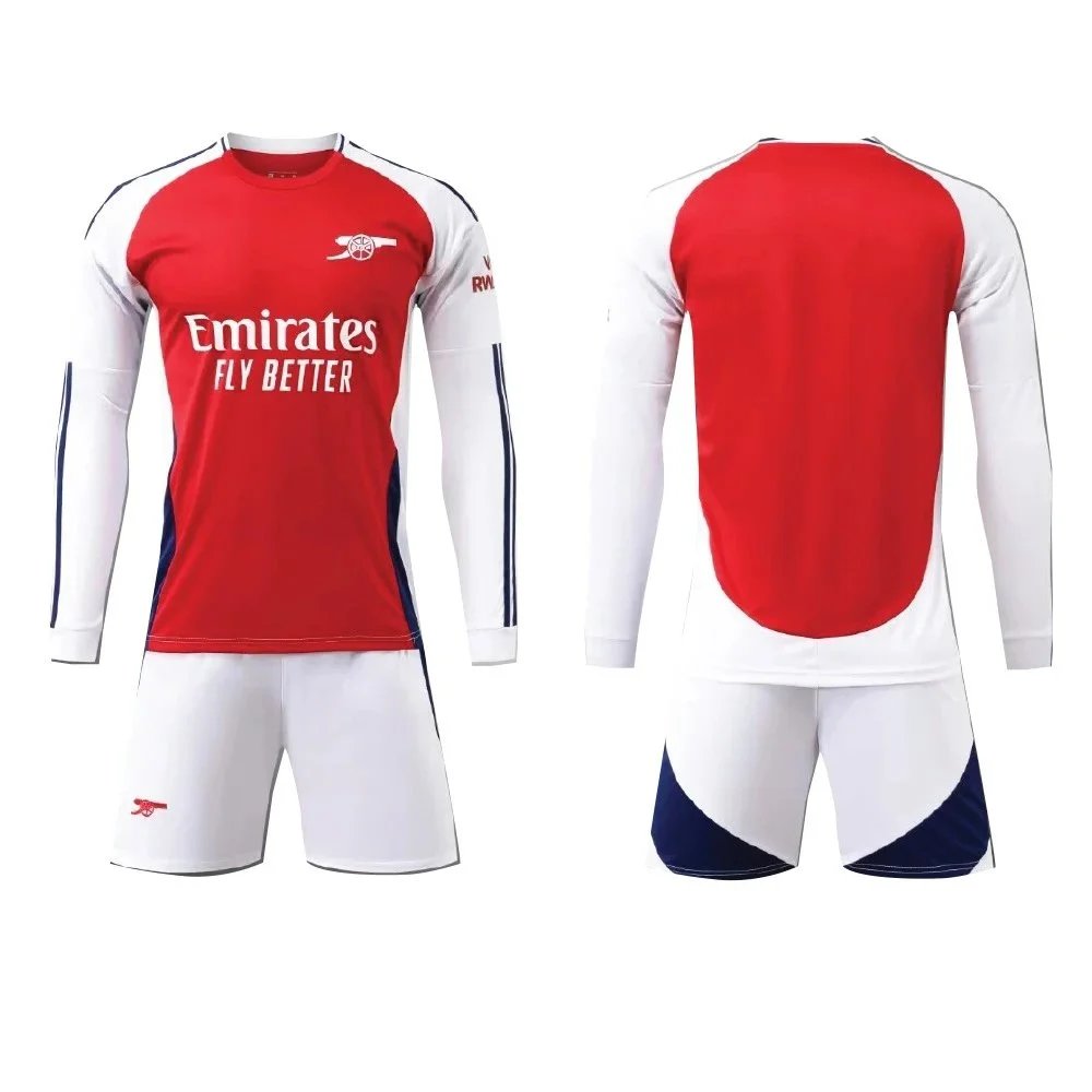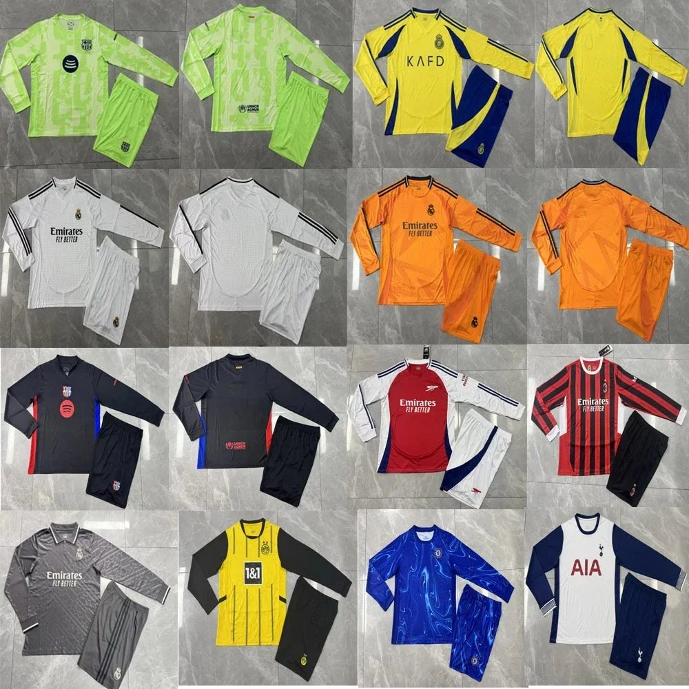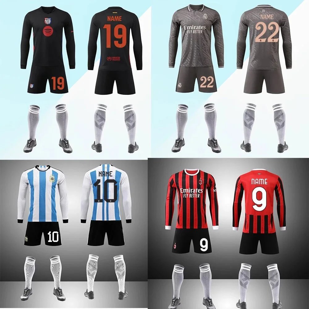 Complete football jersey sets featuring matching shorts and socks for various teams. Includes home, away, and goalkeeper kits in multiple colors and patterns for professional or amateur use.