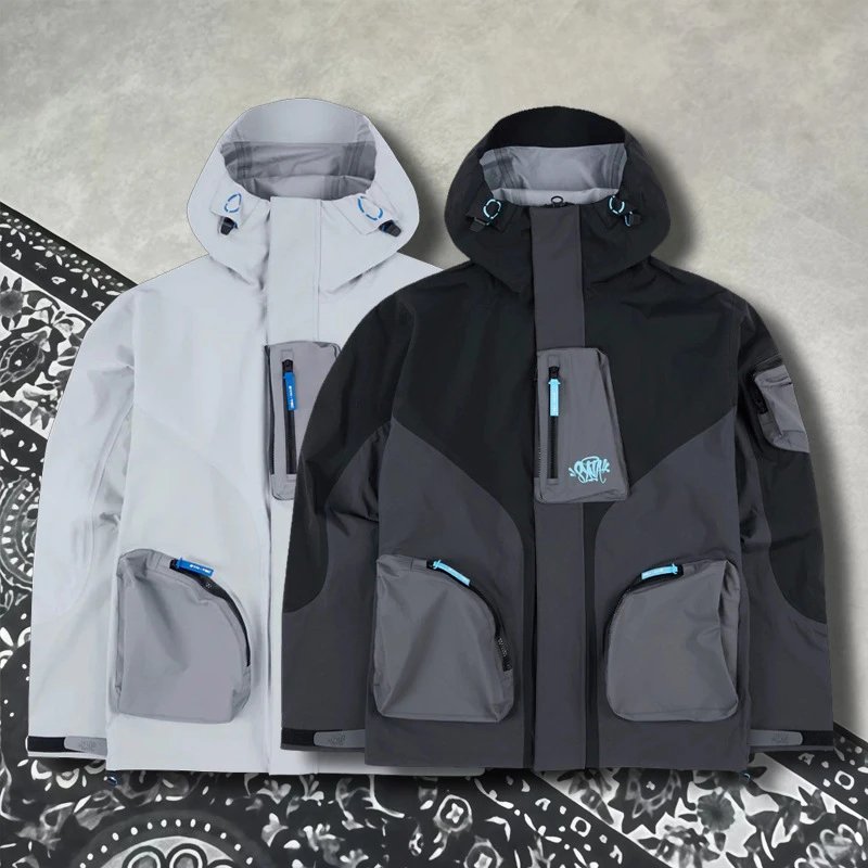Stay protected in style with this black and gray technical hooded jacket featuring bold blue zippers and multiple utility pockets for outdoor adventures.