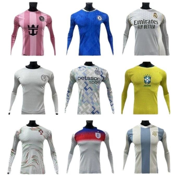 A curated collection of men's football jerseys featuring various team designs, colors, and patterns for fans and players. Includes goalkeeper kits and home/away styles with sponsor logos.