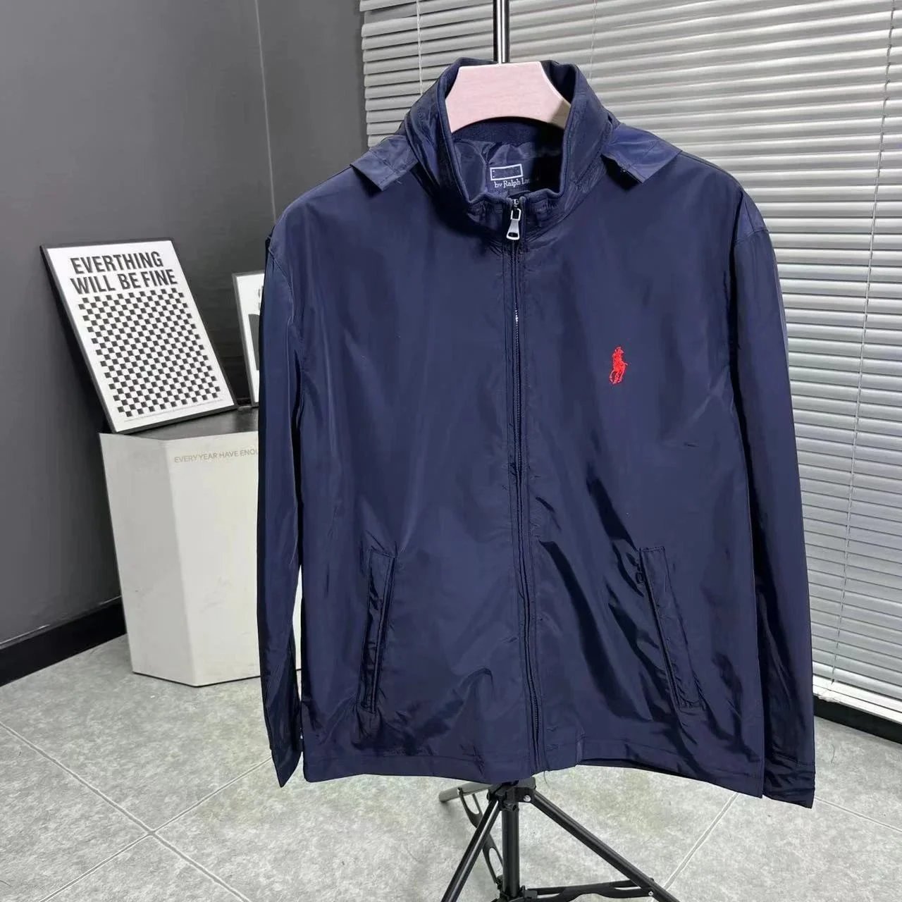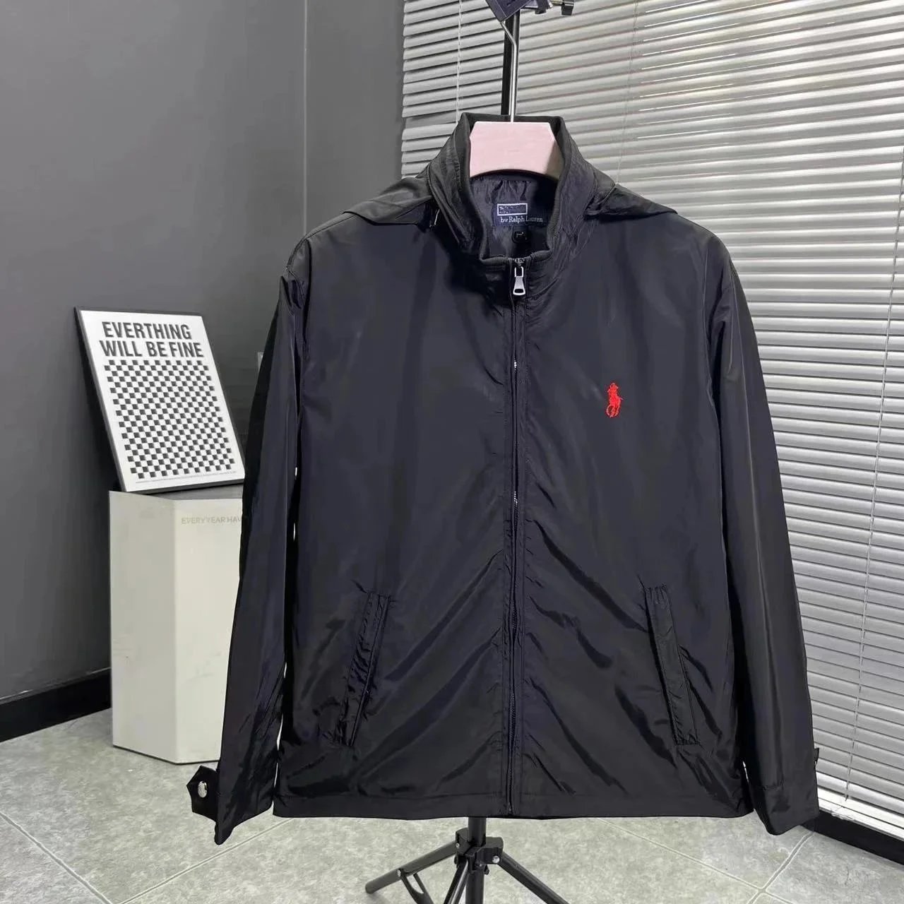 Stylish black Polo Ralph Lauren windbreaker featuring a bold red pony logo and full-zip front. Perfect for casual wear or layering.
