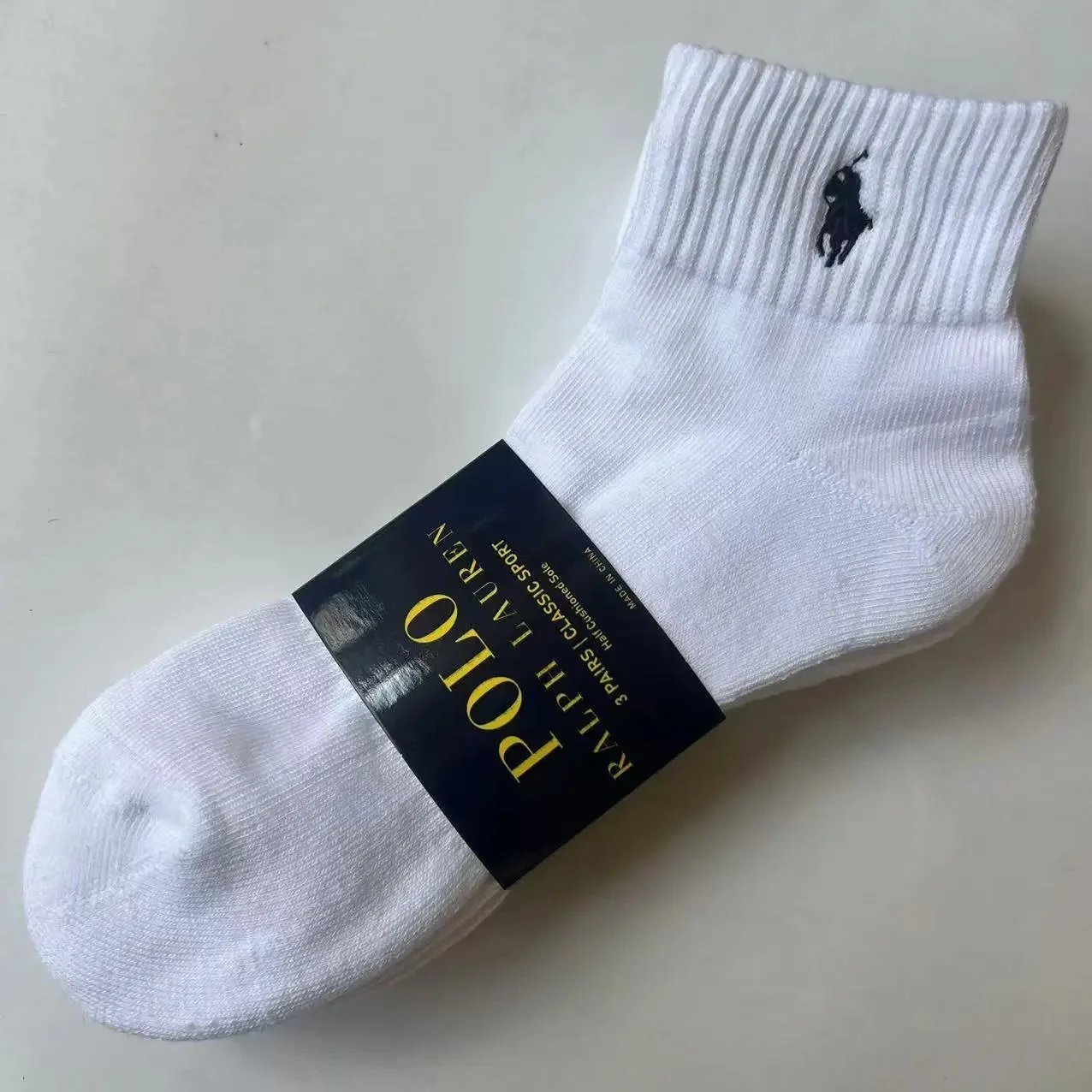 Classic white Polo Ralph Lauren sport socks with ribbed cuff and iconic polo player logo. Ideal for everyday casual wear or athletic use.