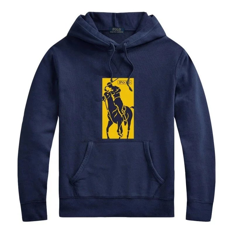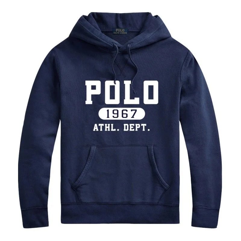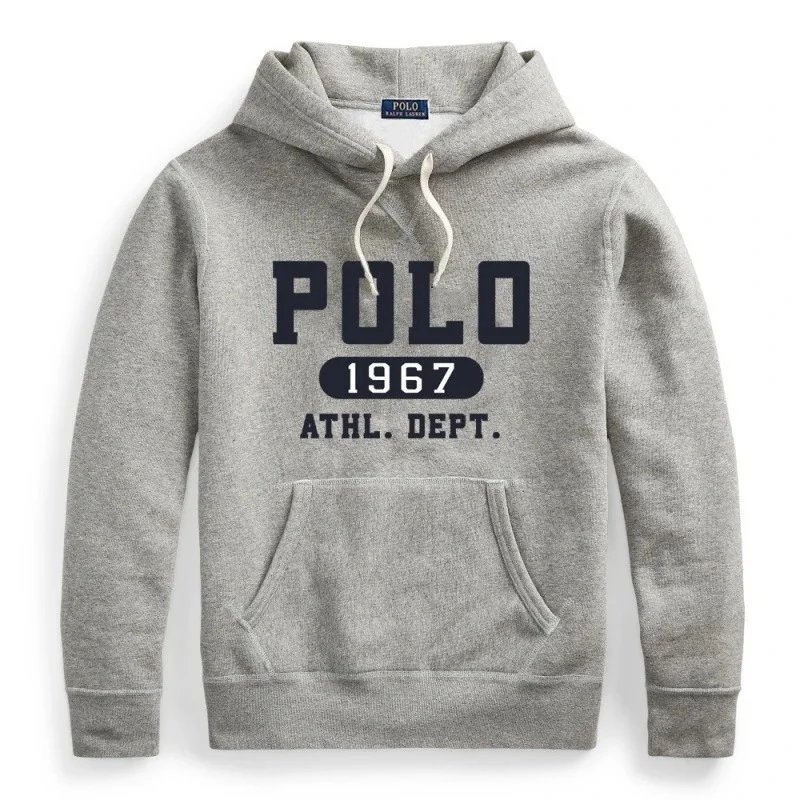 Authentic Polo Ralph Lauren hooded sweatshirts featuring iconic logos including the polo player, 'POLO', '67', 'R-L', and sport-themed graphics. Available in classic gray, navy, black, and red colorways with premium cotton construction.
