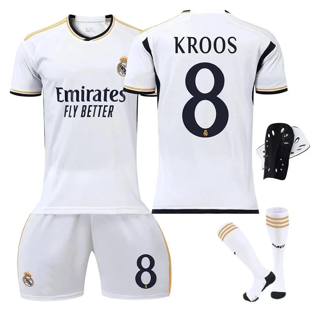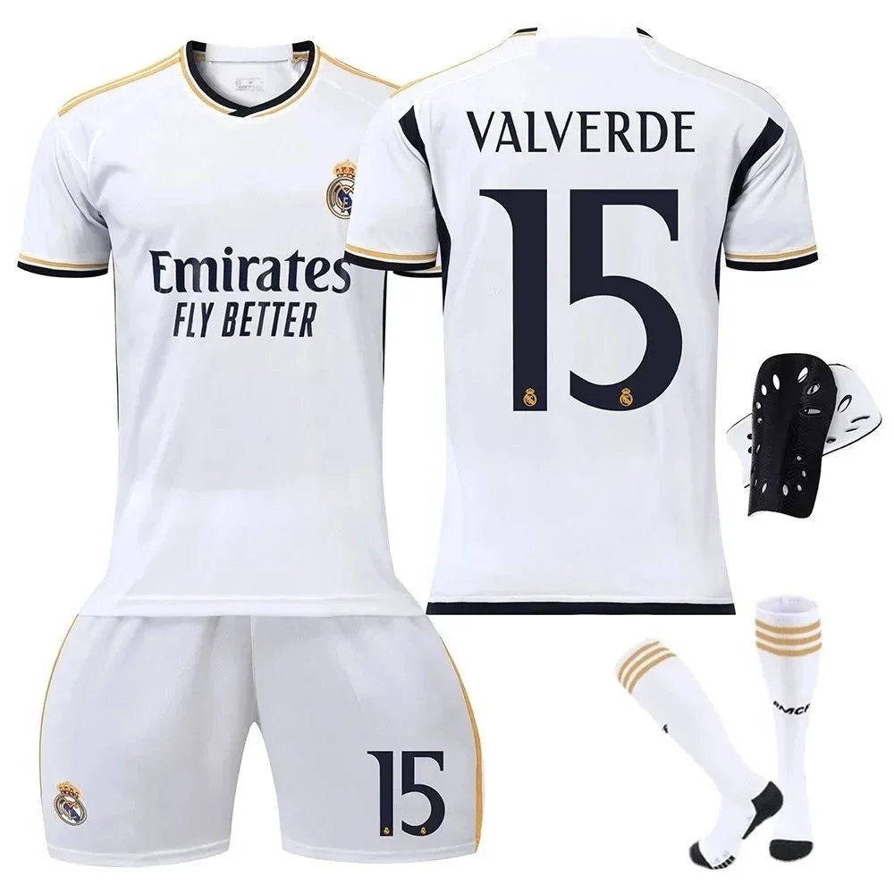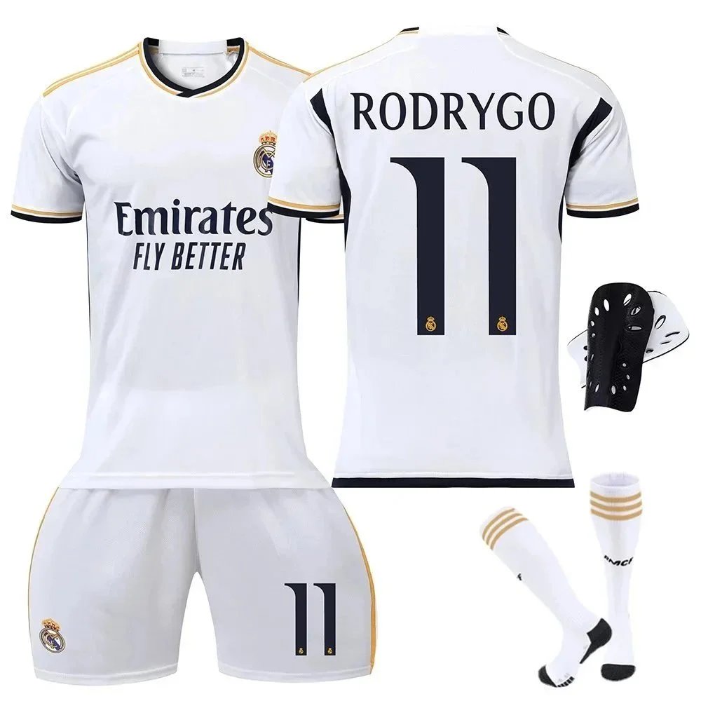 Authentic Real Madrid home jersey set featuring Vinicius Jr. #7, with white kit, gold accents, and official club branding. Includes matching shorts, socks, and shin guards for complete on-field look.