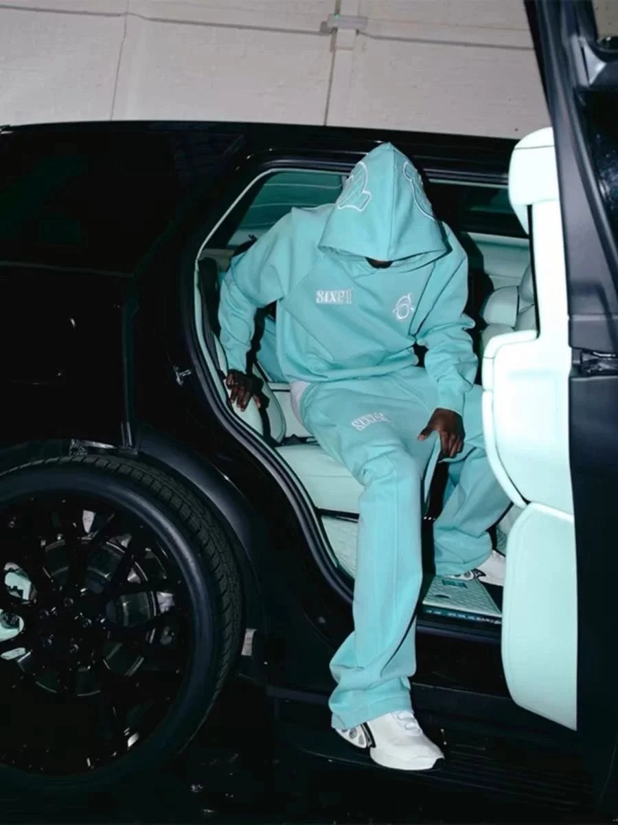 Shop the SIXPM matching hoodie and sweatpants set in mint, black, or light blue. Featuring bold logo embroidery and relaxed fit for ultimate comfort.