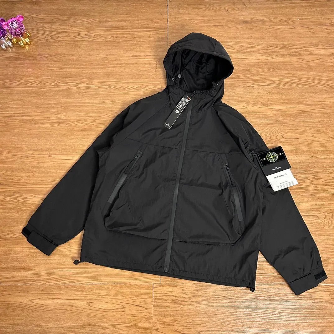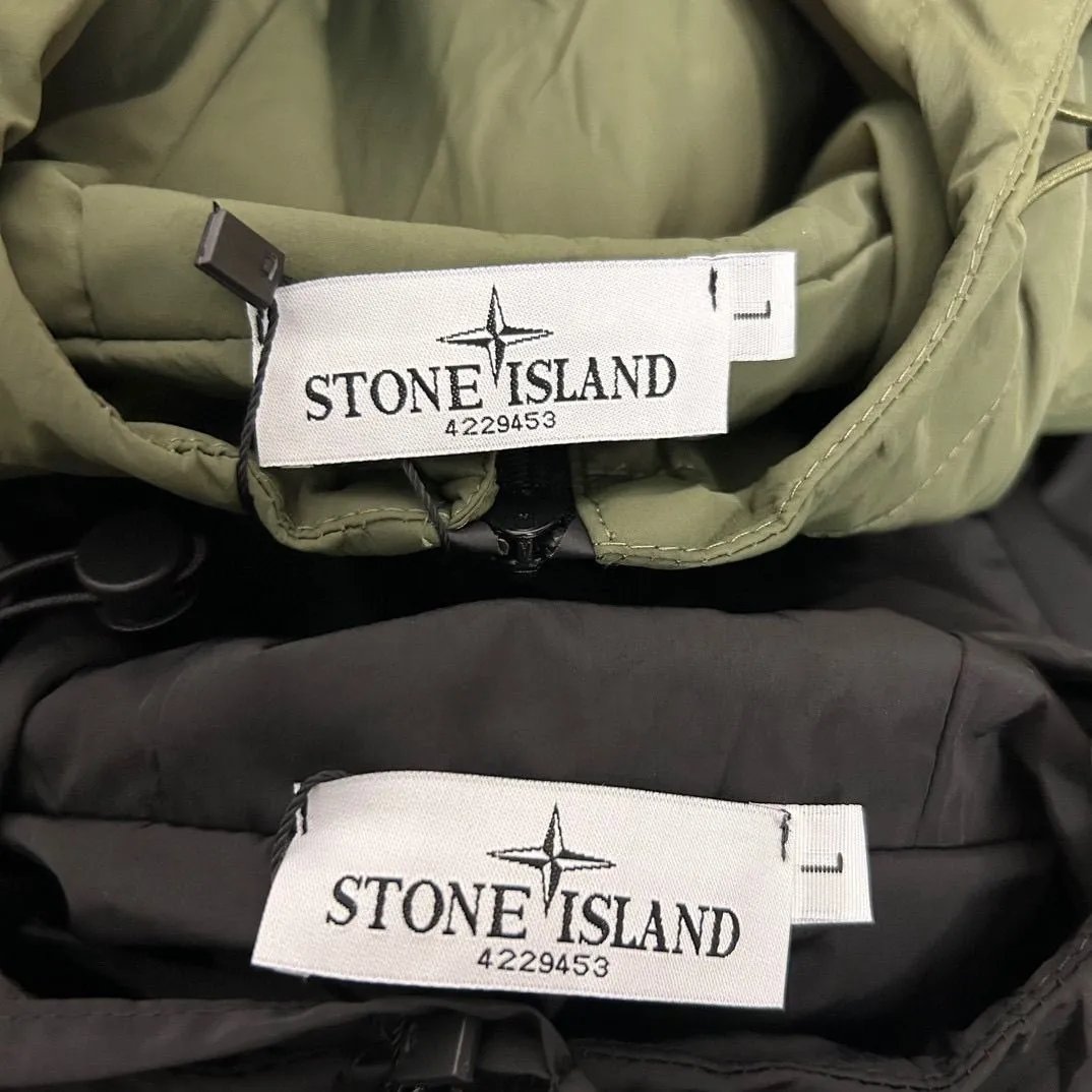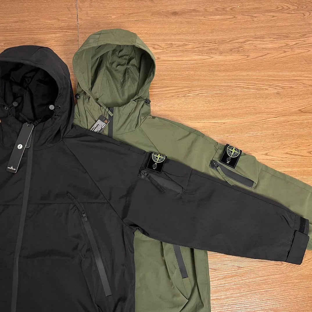 Discover the premium Stone Island raincoat jacket in sleek black and rugged green. Built for performance with weather-resistant fabric and signature detailing.