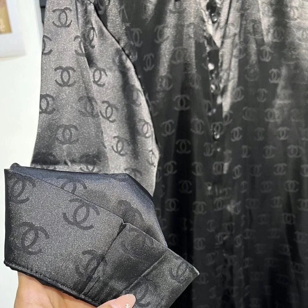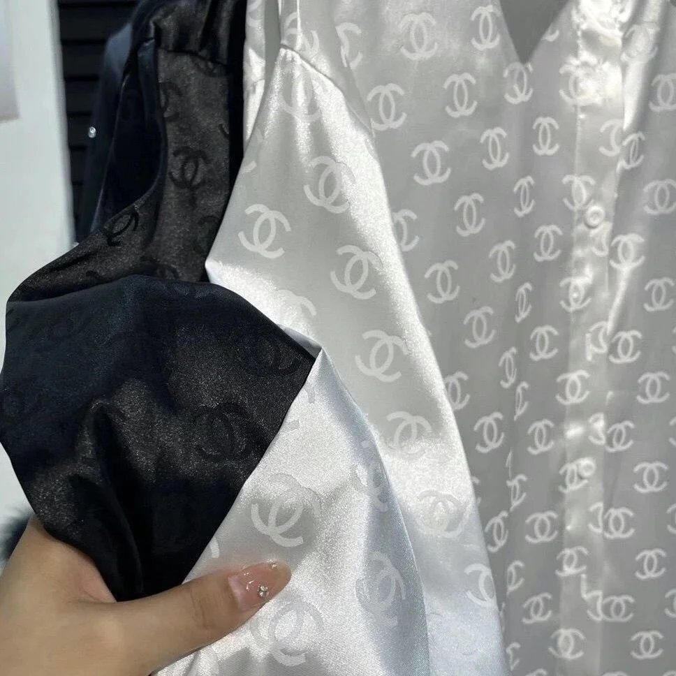 Elegant white silk blouse featuring repeating CC logo pattern, ideal for casual or semi-formal wear. Soft satin texture and classic collar design offer a luxurious feel.